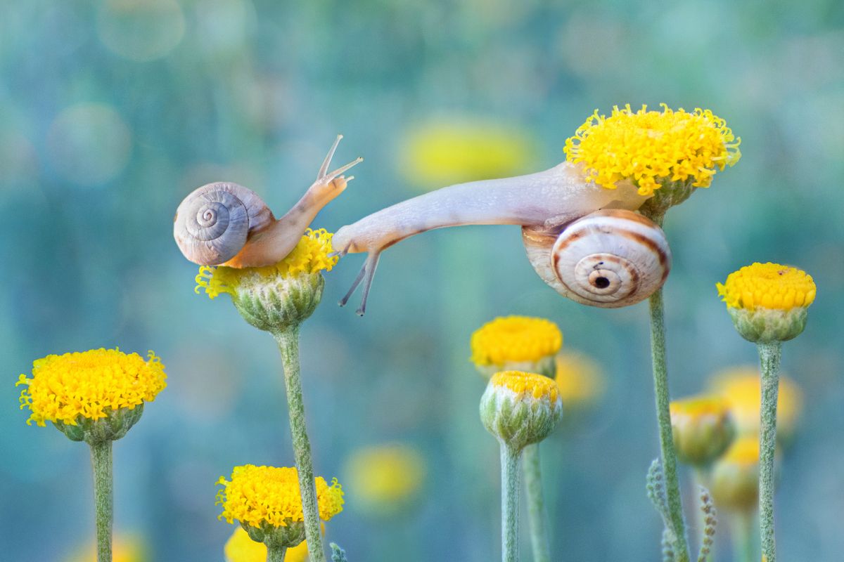 На фоне размытого синего света, словно утреннего неба, два маленьких существа — улитки — устроили свой мир на желтых цветах. Одна осторожно ползет по стеблю, другая, с вытянутой шеей, словно приветствует соседку. Сцена наполнена тишиной и нежностью, будто природа замерла, чтобы запечатлеть этот миг. Фотограф Людмил@ передаёт волшебство макро-мира, где даже улитки становятся героями. Каждый цветок — как маленький островок в синем море света.