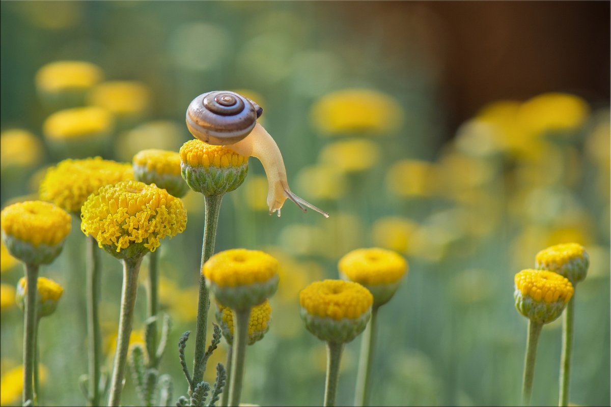 улитка, цветы сантолины, майское утро, Людмила Бекман