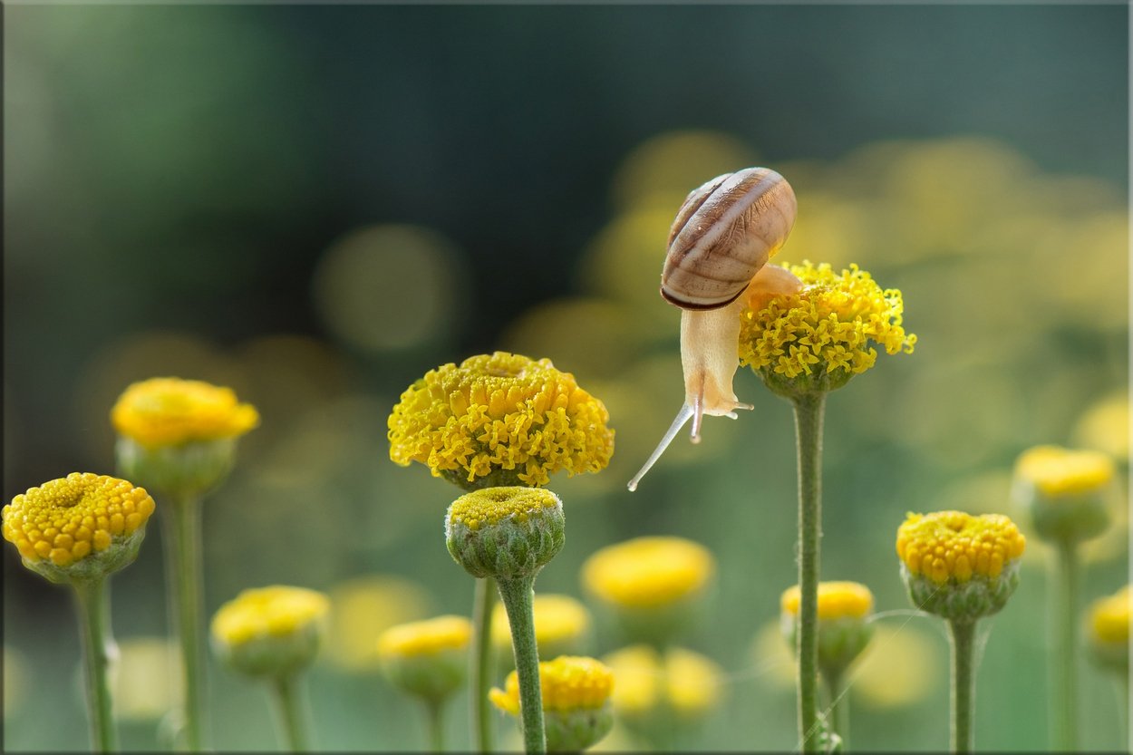 улитка, цветы сантолины, майское утро, Людмила Бекман