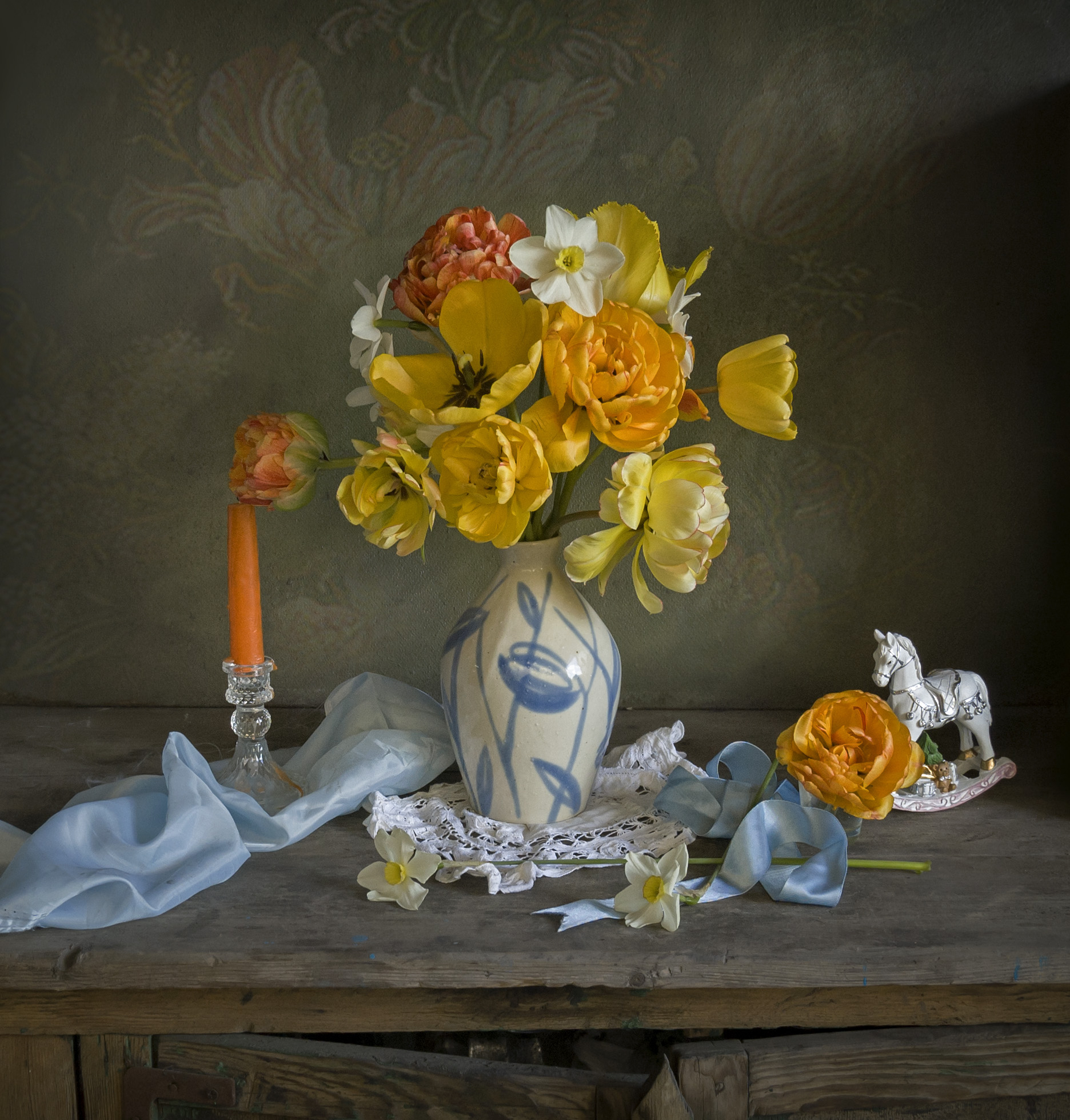 Лионела, очень нежная композиция 💛 Цвета и текстуры подобраны гармонично — особенно удачно смотрится сочетание желтых тюльпанов и голубой ленты на фоне старой древесины. Простота и тепло в каждом элементе.