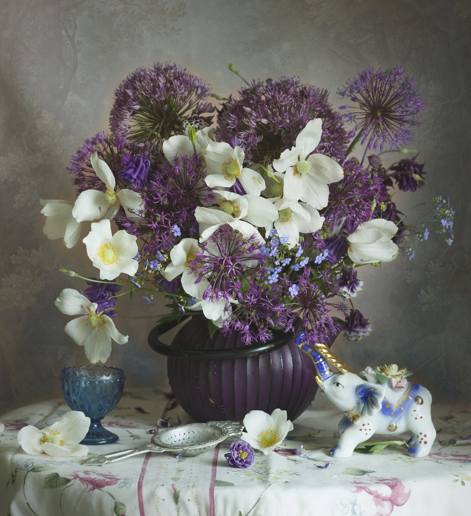 анемоны, букет цветов, фарфоровая статуетка, слоник, ситечко, чайник, лук декоративный, Лионелла Зимина