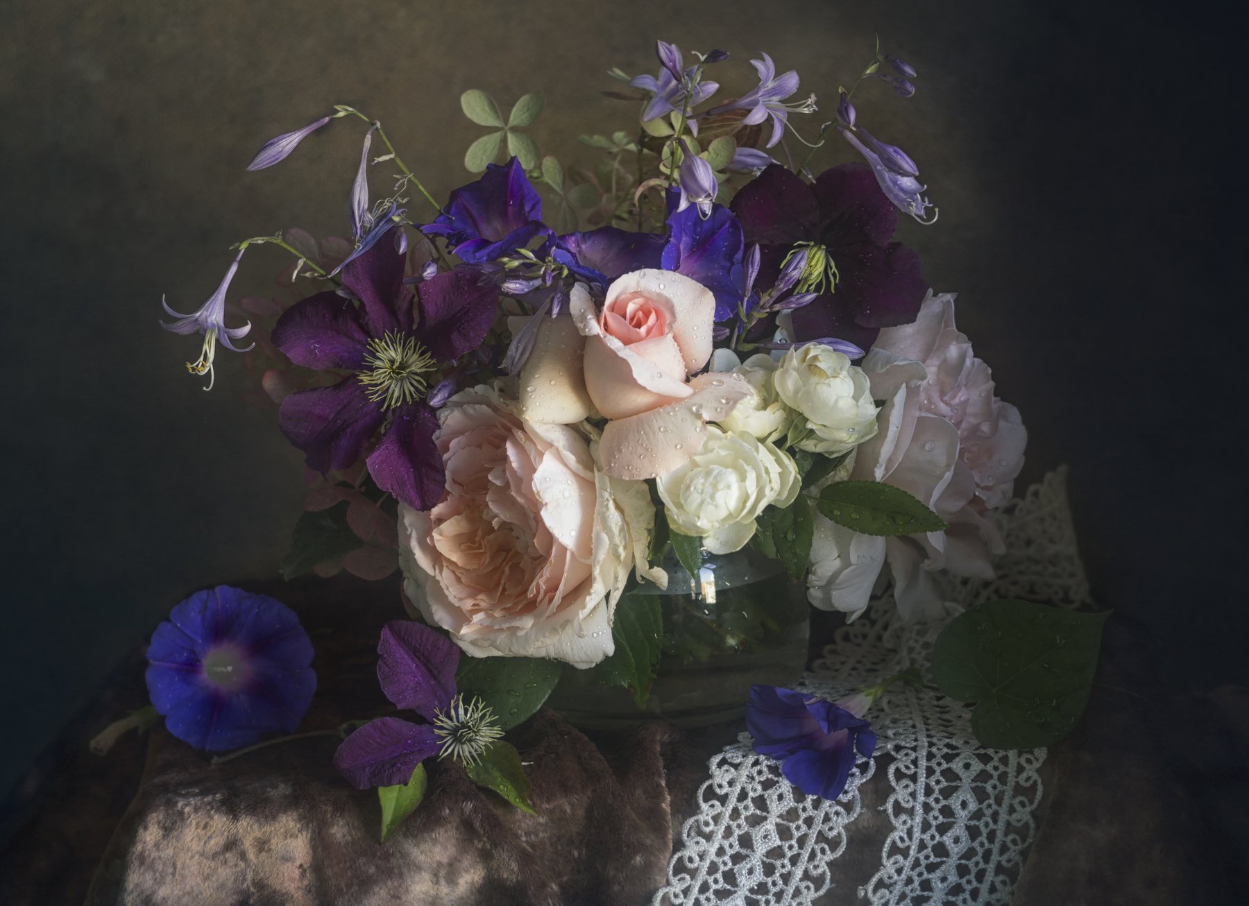 Букет цветов, розы, бархат, кружево, клематис, вьюнок, Лионелла Зимина