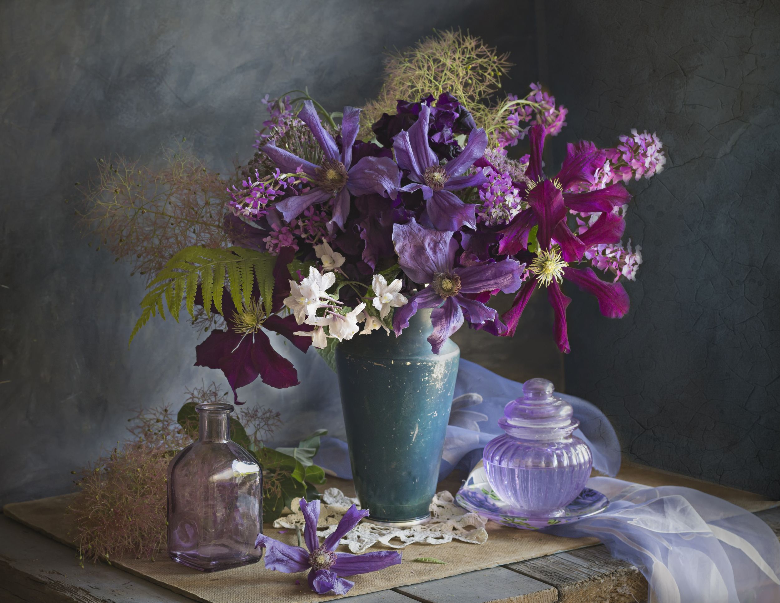 букет цветов, клематисы, натюрморт, ваза, Лионелла Зимина