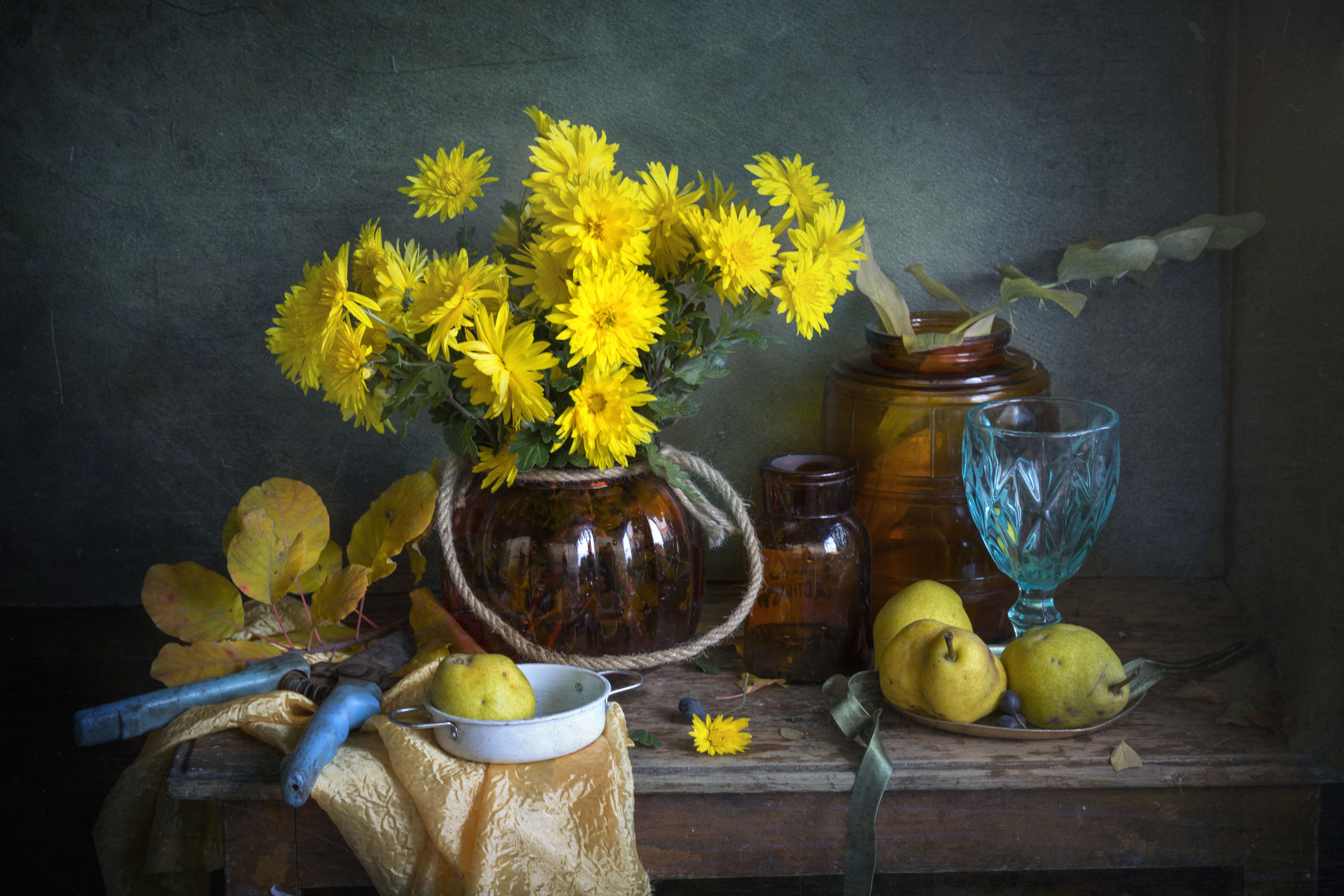 хризантемы, груши, натюрморт, баночки, осень, Зимина Лионелла