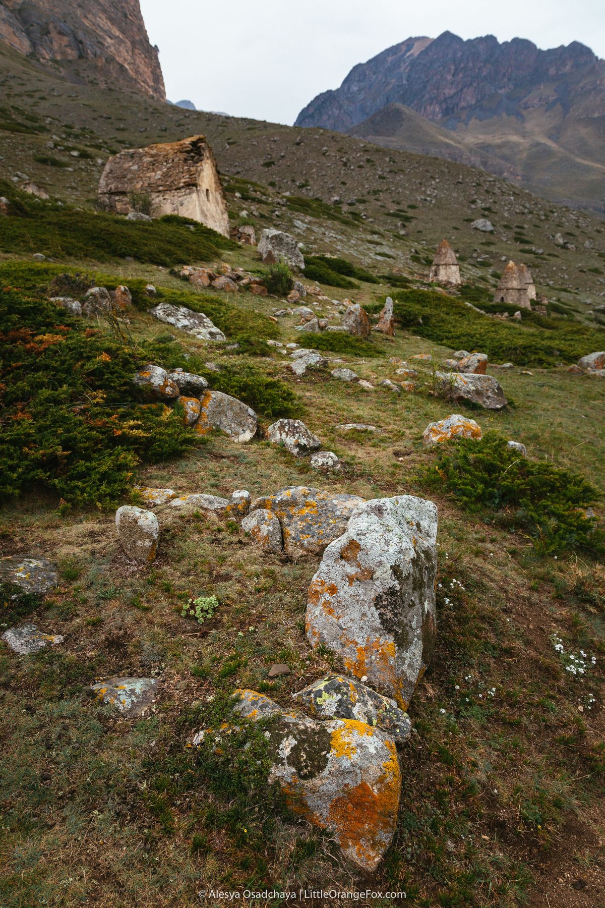 Когда я спрашиваю у людей, что посмотреть в Чегемском ущелье, большинство вспоминает лишь про Чегемские водопады. Ещё часть, про базу парапланеристов Парадром. Но если проехать по грунтовой дороге ещё дальше, вглубь ущелья до большой долины, вы наткнётесь на небольшое село Эльтюбю, где на склоне горы, под отвесными скалами стоят старинные склепы горцев. Даргавс в миниатюре, место почти без туристов, забора, да и вид поинтереснее, на мой взгляд.
