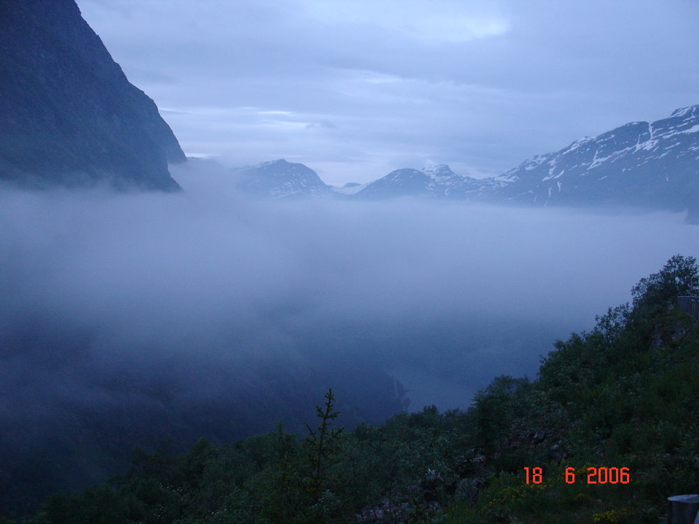 с ледника вниз к фьорду.утром туман сошел.иногда показывалось солнце.Внизу на приколе стоял корабль с туристами Astoria.а вода была с бирюзовым оттенком