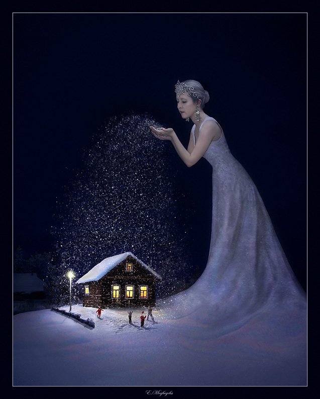 Во-первых, сильно сбивает розовые пятна на снегу и платье. Какой-то совершенно "левый" оттенок. Желтый был бы более-менее логичен, вииду светящихся окошек. А розовый - ну никак.