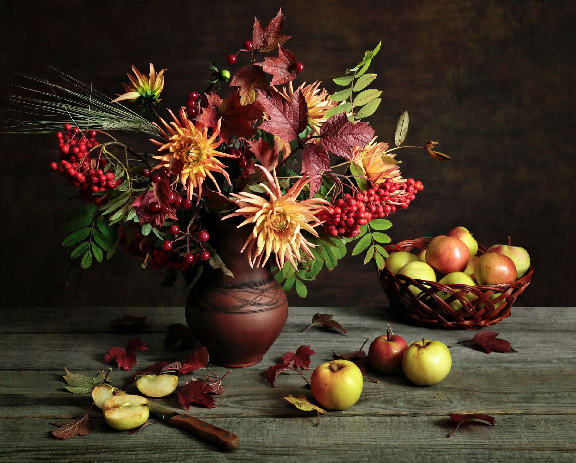 Яблоки, калина, рябина, кринка, нож, Вера Лопатина