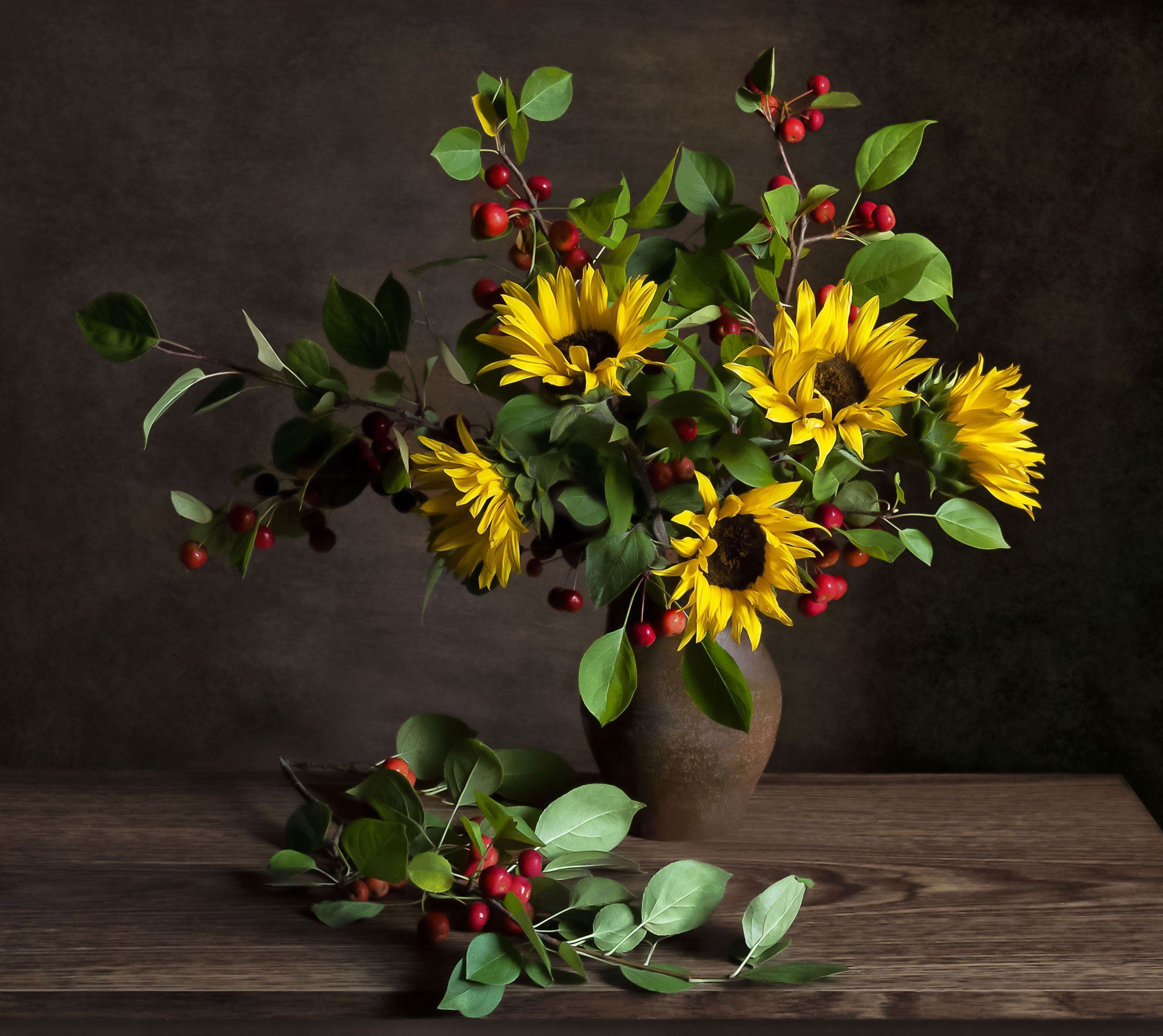 натюрморт, букет, цветы, подсолнухи, яблоки, ранетки, кринка, Вера Лопатина