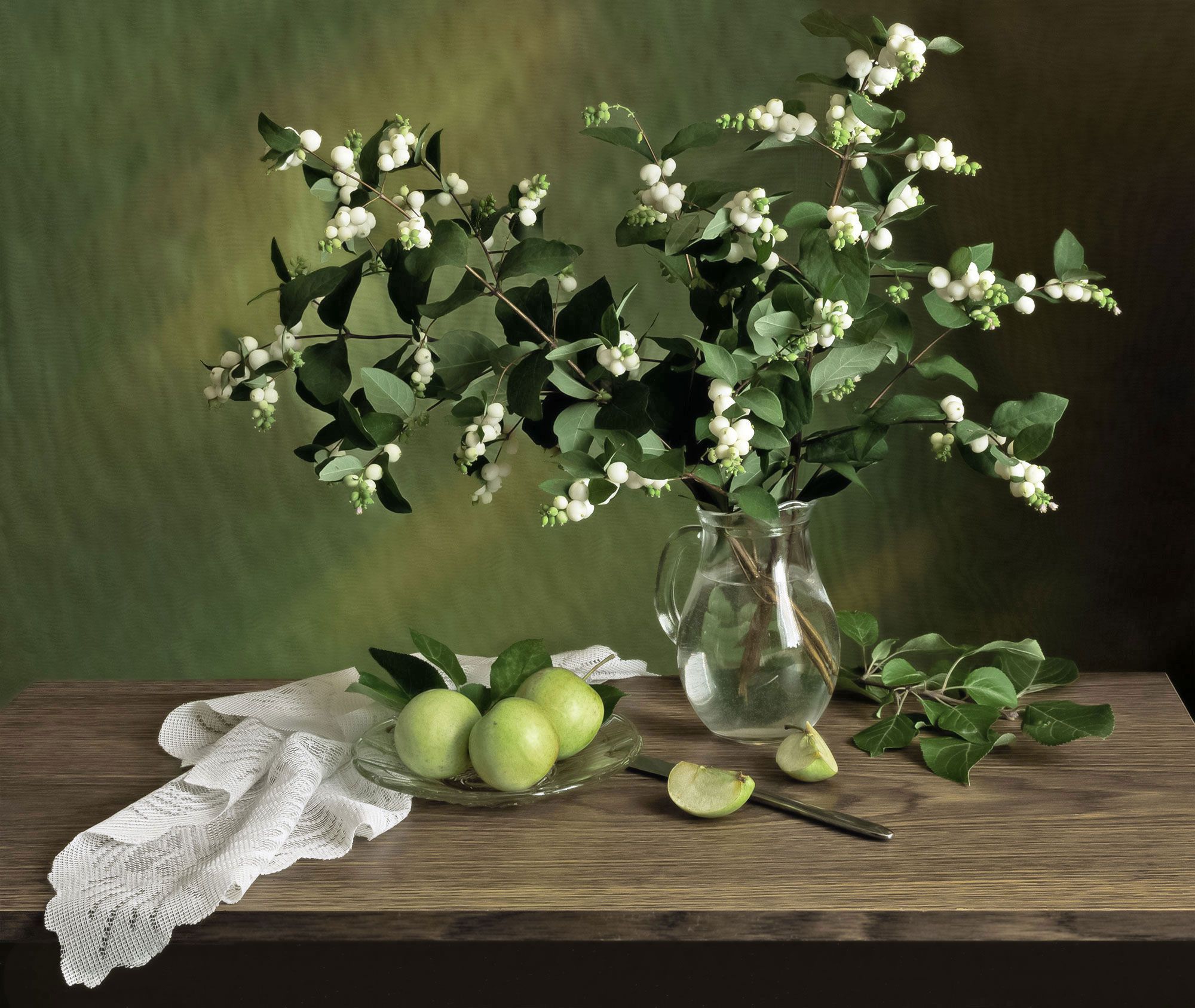 натюрморт, букет, снежноягодник, яблоки, салфетка, нож, кувшин, тарелка, Вера Лопатина