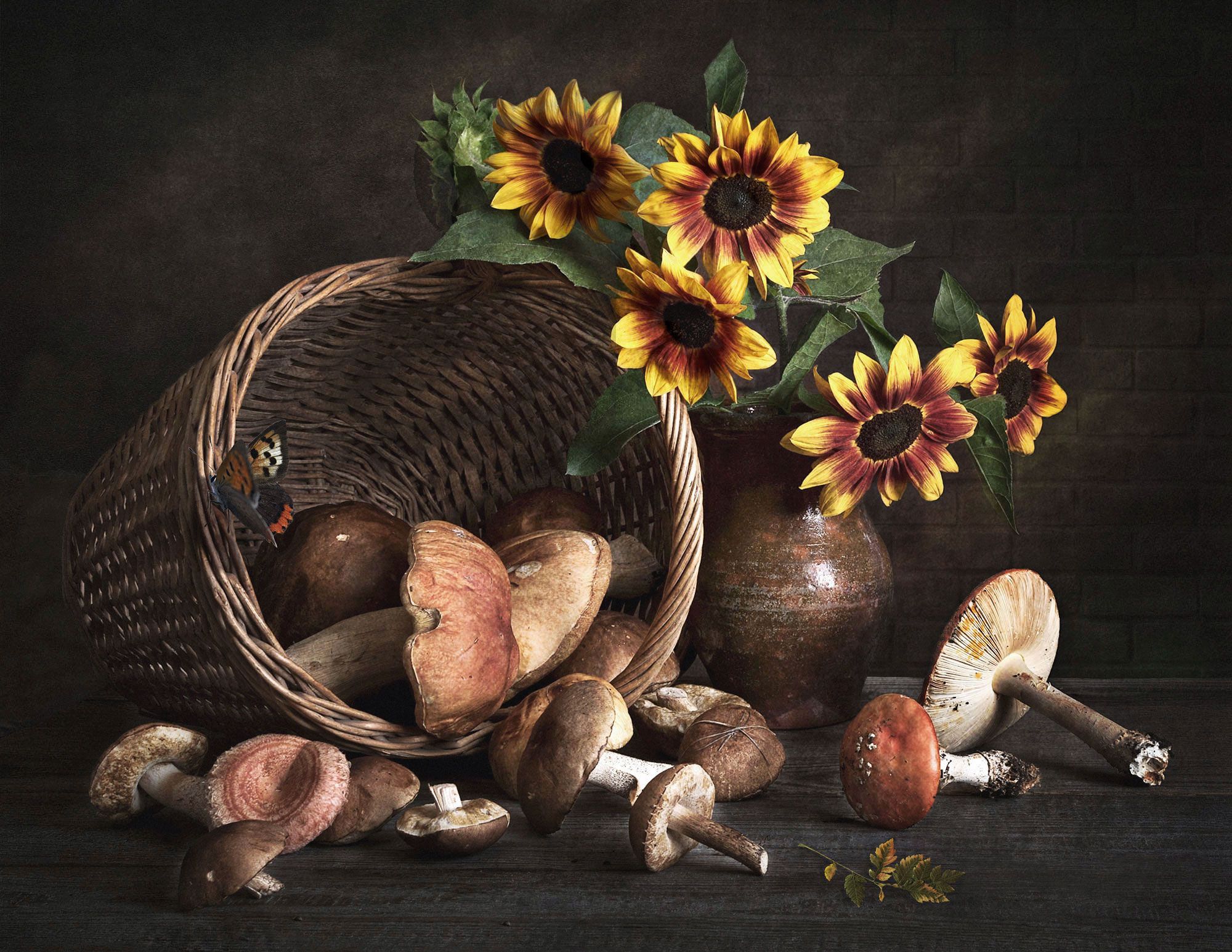 натюрморт, грибы, корзинка, кринка, подсолнухи, цветы, бабочка, Вера Лопатина
