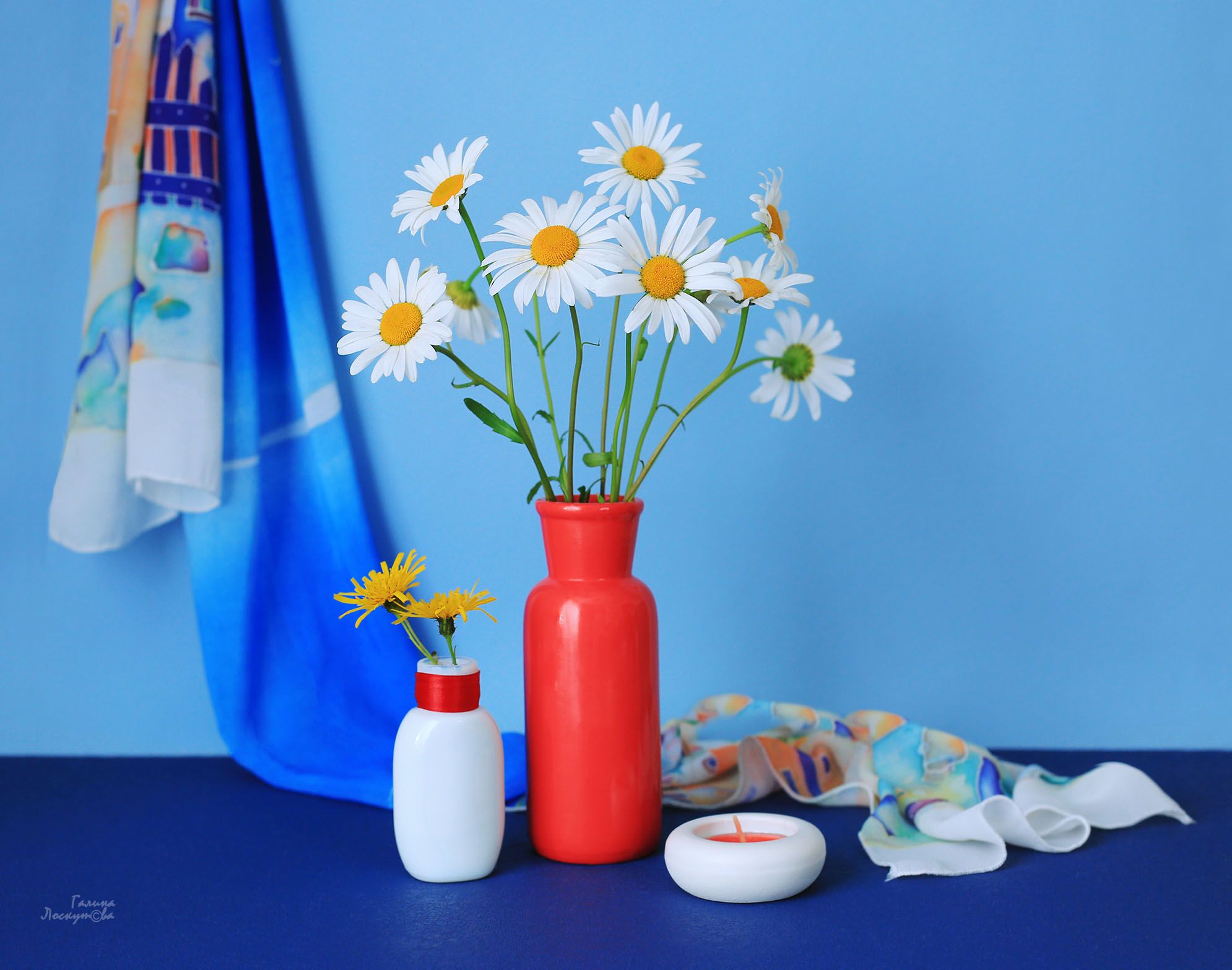 ромашки, разноцветный шарф, синий фон, красная ваза, подсвечник, белый пузырек, букет, Галина Лоскутова