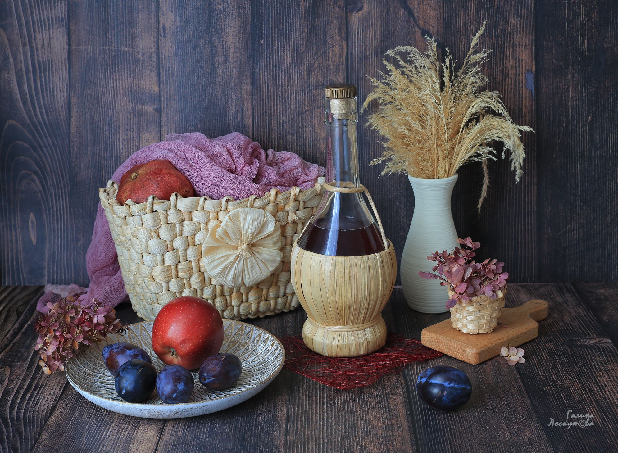 соломенная корзинкасливыгранатяблокосухоцветыразделочная доска