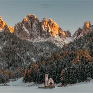 На снимке — деревня Санта-Лючия в долине Сельва-Кадоре, Италия, в сердце Доломитовых Альп. На переднем плане — уютные дома и белоснежная церковь, возвышающаяся на холме. На заднем плане — грандиозные вершины, включая Монте-Пельмо, под драматическим небом с переливающимися облаками. Свет и тени создают контраст, подчеркивающий рельеф гор и архитектуру поселения. Фотография передаёт атмосферу летнего дня в горах — спокойствие, величие и гармонию природы с человеком.