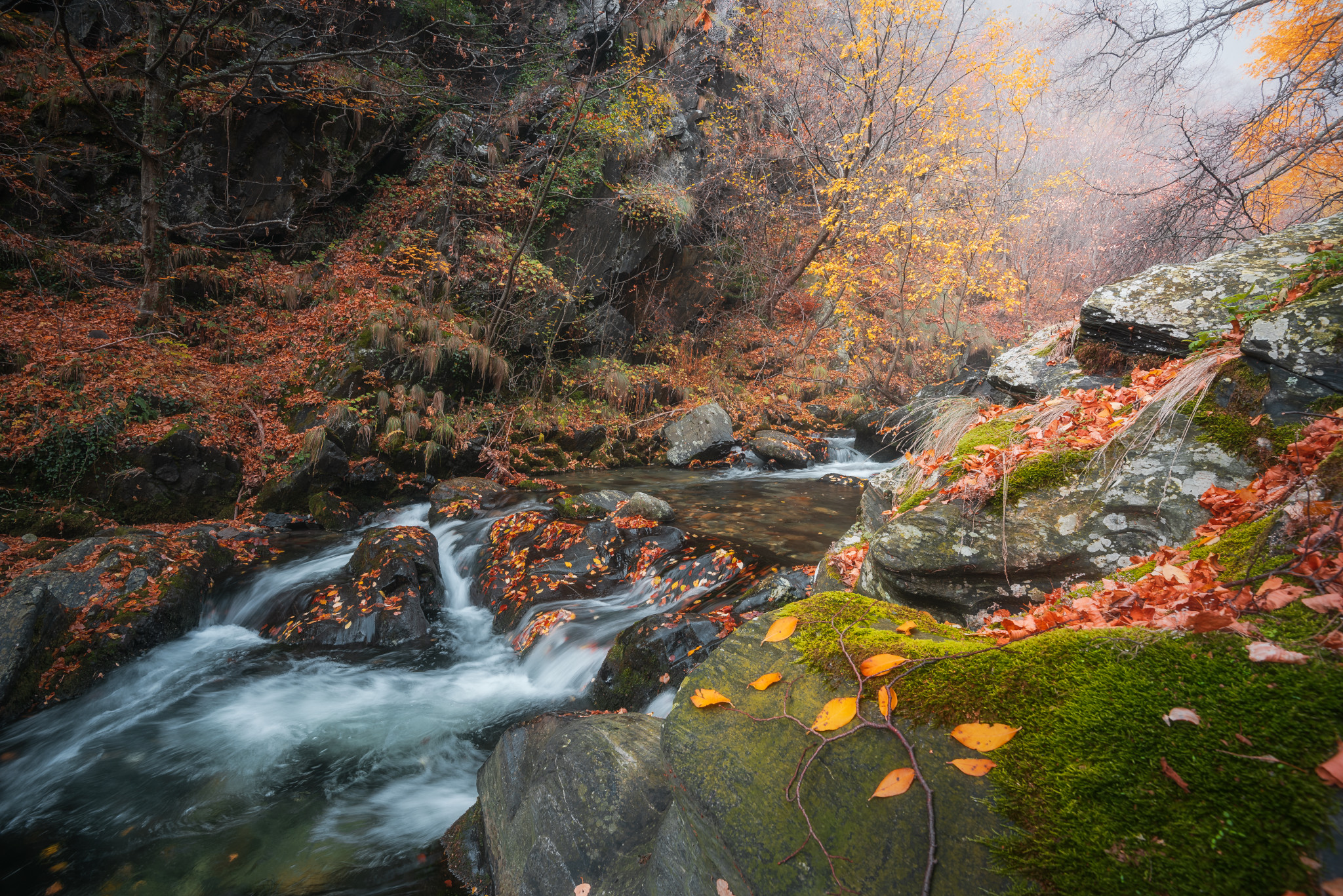 Nice fall scene — the water’s smooth and the mossy rocks pop with color. Autumn leaves scattered over the stones add warmth. The light’s soft, and the stream moves just right. Solid shot.