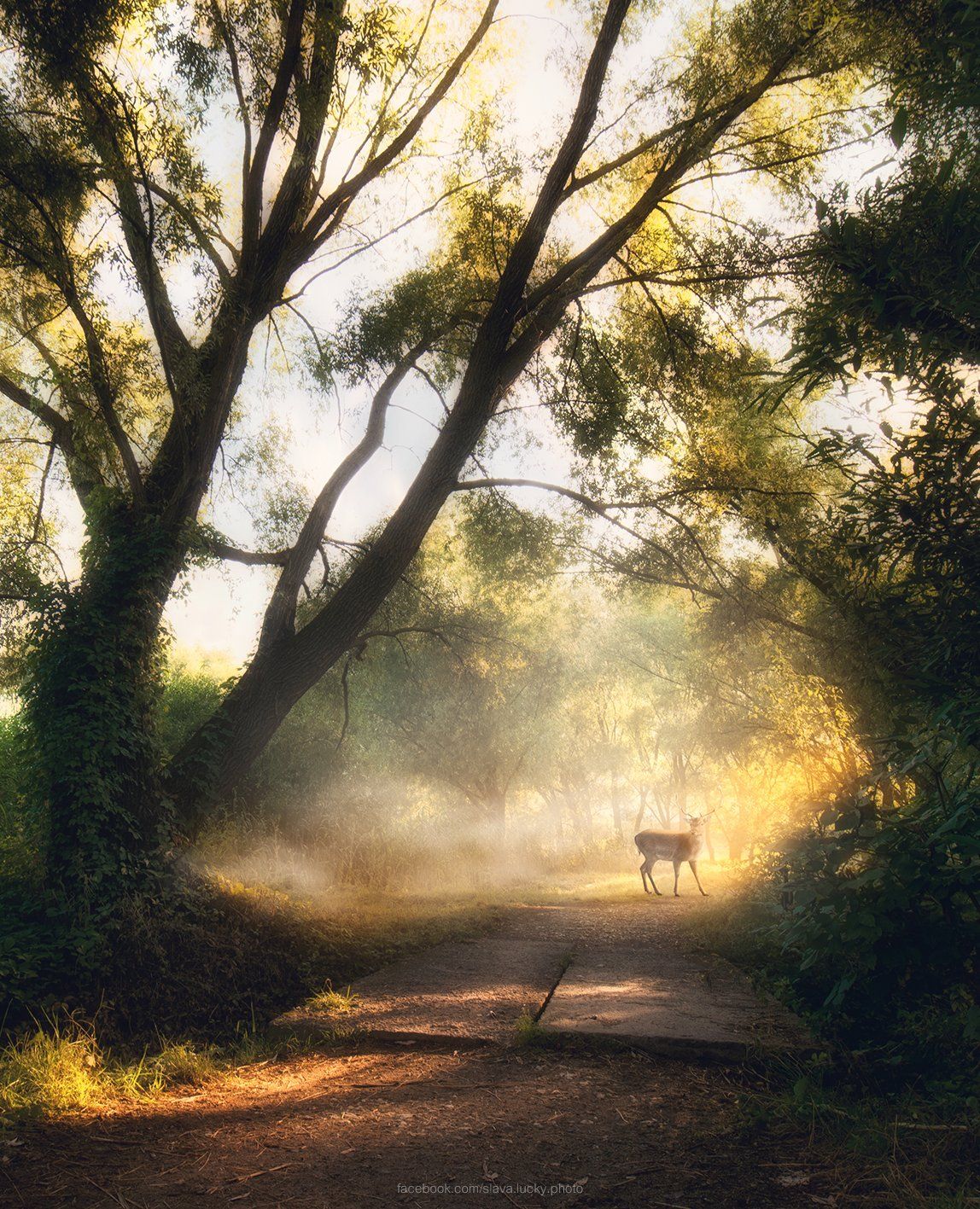 утро, туман, деревья, свет, лучи, лето, олень , Slava Lucky