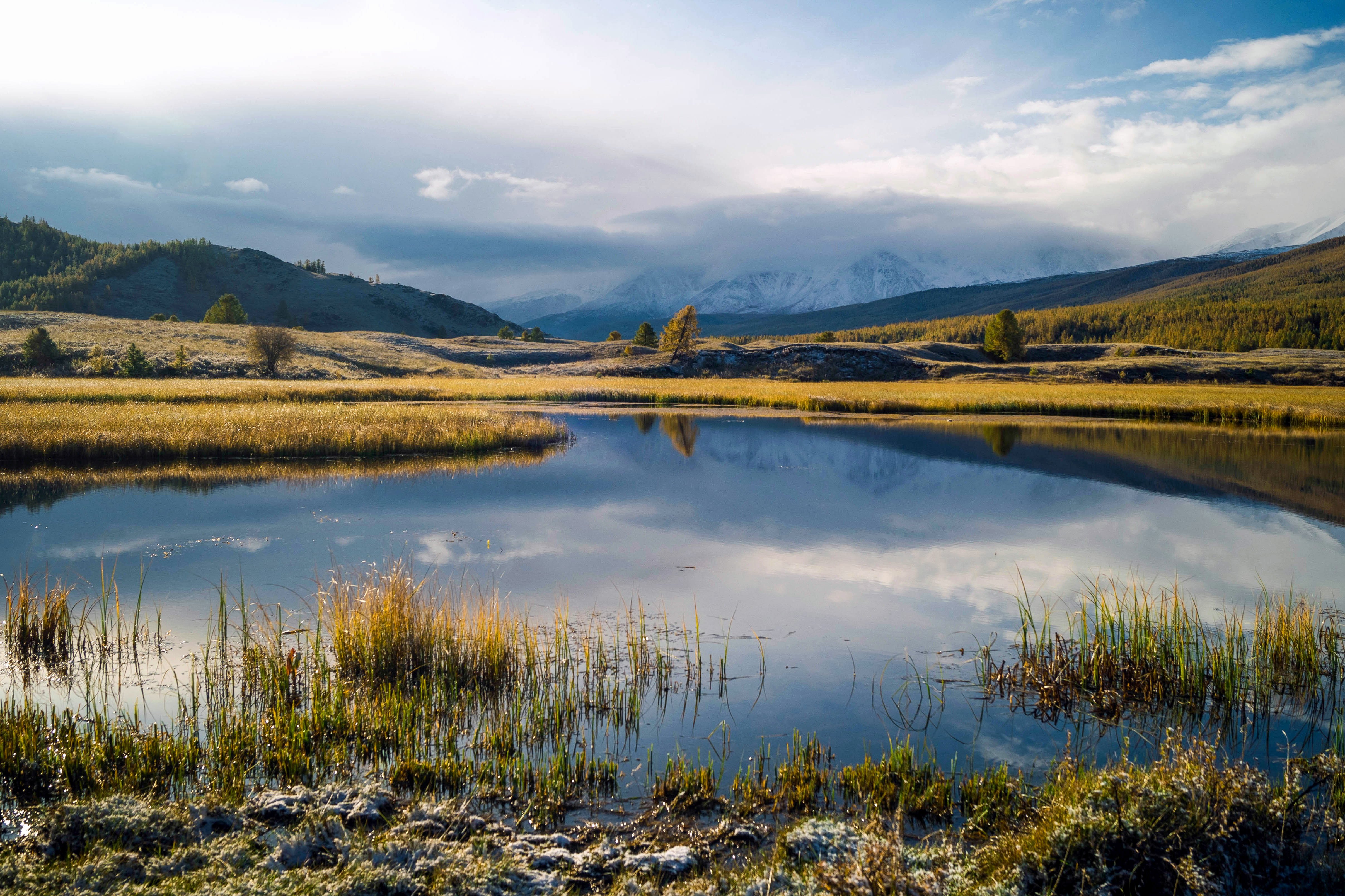 природа пейзаж алтай утро горы вершины облака ештыколь озеро отражение, Людмила