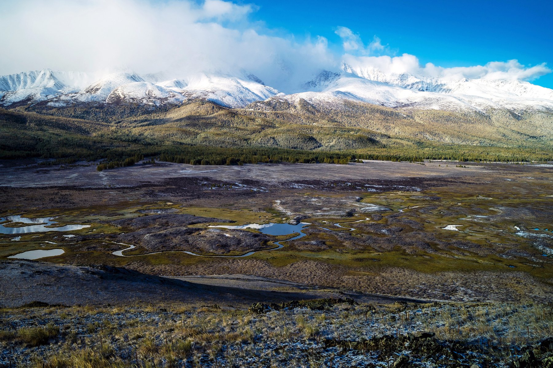 Урочище Ештыкель, Горный Алтай. Поднявшись на гору можно увидеть сеть озер и Северо-Чуйский хребет с его вершинами Актру 4044м и Куркурек 3982м. Яркие краски осени с утра слегка припорошило снегом.