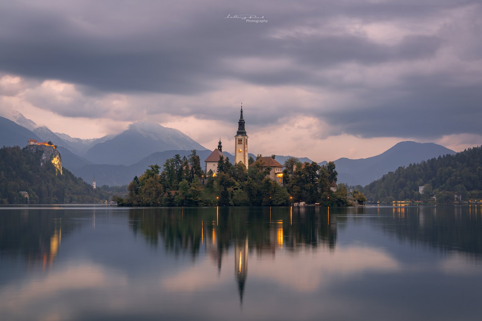 bled, blue, blue hour, calm waters, calmness, castle, church, church tower, cliff, clouds, evening, fog, forest, hills, island, lake, lake bled, lights, mountain range, mountains, reflections, rock, serenity, silence, sky, slovenia, tower, twilight, water, Ludwig Riml