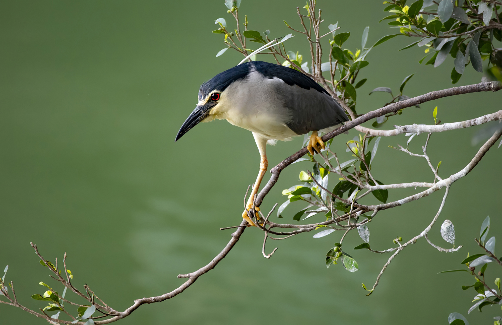 На снимке запечатлена ночная кваква (Nycticorax nycticorax), сидящая на изогнутой ветке дерева. Птица имеет характерное черное оперение головы и спины, серые крылья и желтые глаза. Ее длинный клюв направлен вниз, что типично для охотничьей позы. Фон представляет собой размытую зеленую водную гладь, создающую мягкий контраст с фигурой птицы. Фотография выполнена крупным планом, позволяя рассмотреть детали оперения и выражение птицы.