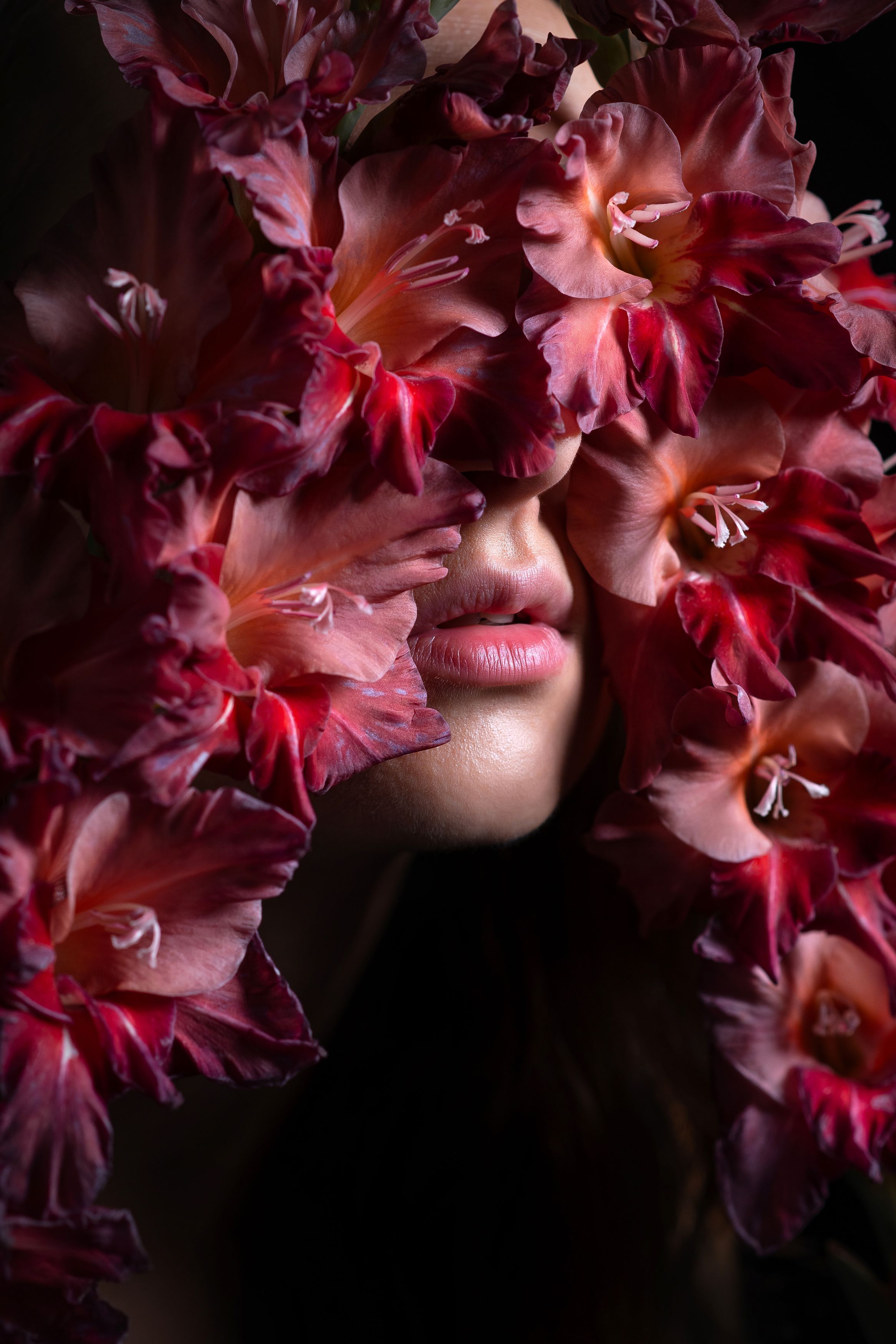 Valeria, the contrast between the deep red petals and skin tone works well here. The composition draws focus to the lips, though the lighting could be slightly softer for more detail.