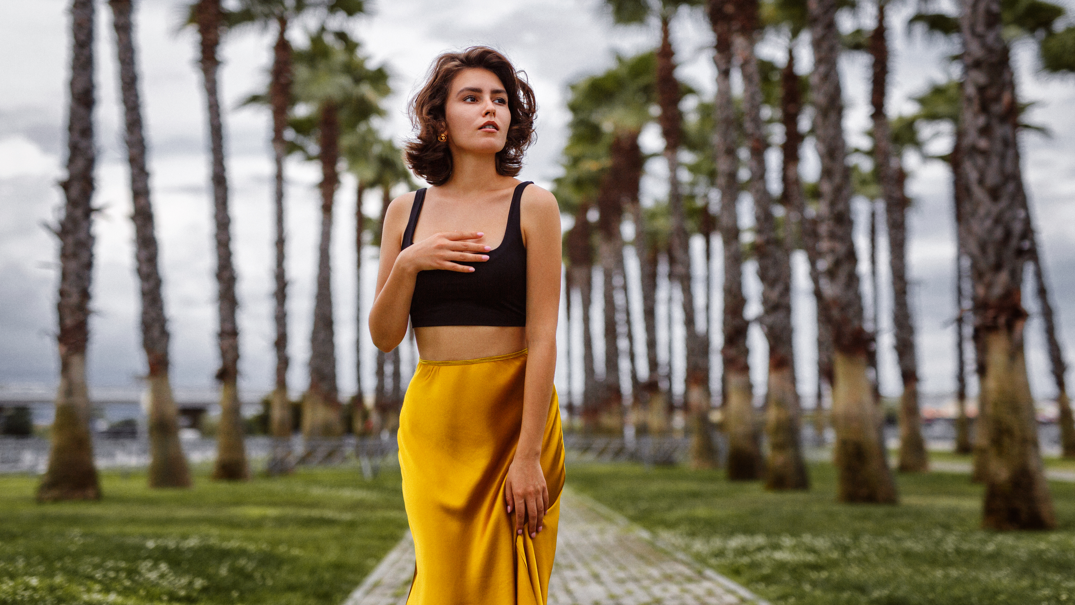 Женщина в чёрном топе и яркой жёлтой юбке стоит на аллее среди пальм. Композиция выстроена с акцентом на вертикальные линии стволов — они ведут взгляд к фигуре. 🌴💛