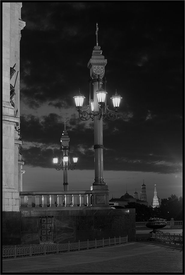 В данном случае цветной вариант лучше, поскольку выразительней. И свет фонарей и небо и цветная архитектура выглядят очень хорошо. ЧБ вариант больше походит на репродукцию к пушкинской "Шинели", "Медному всаднику" или подобным произведениям.