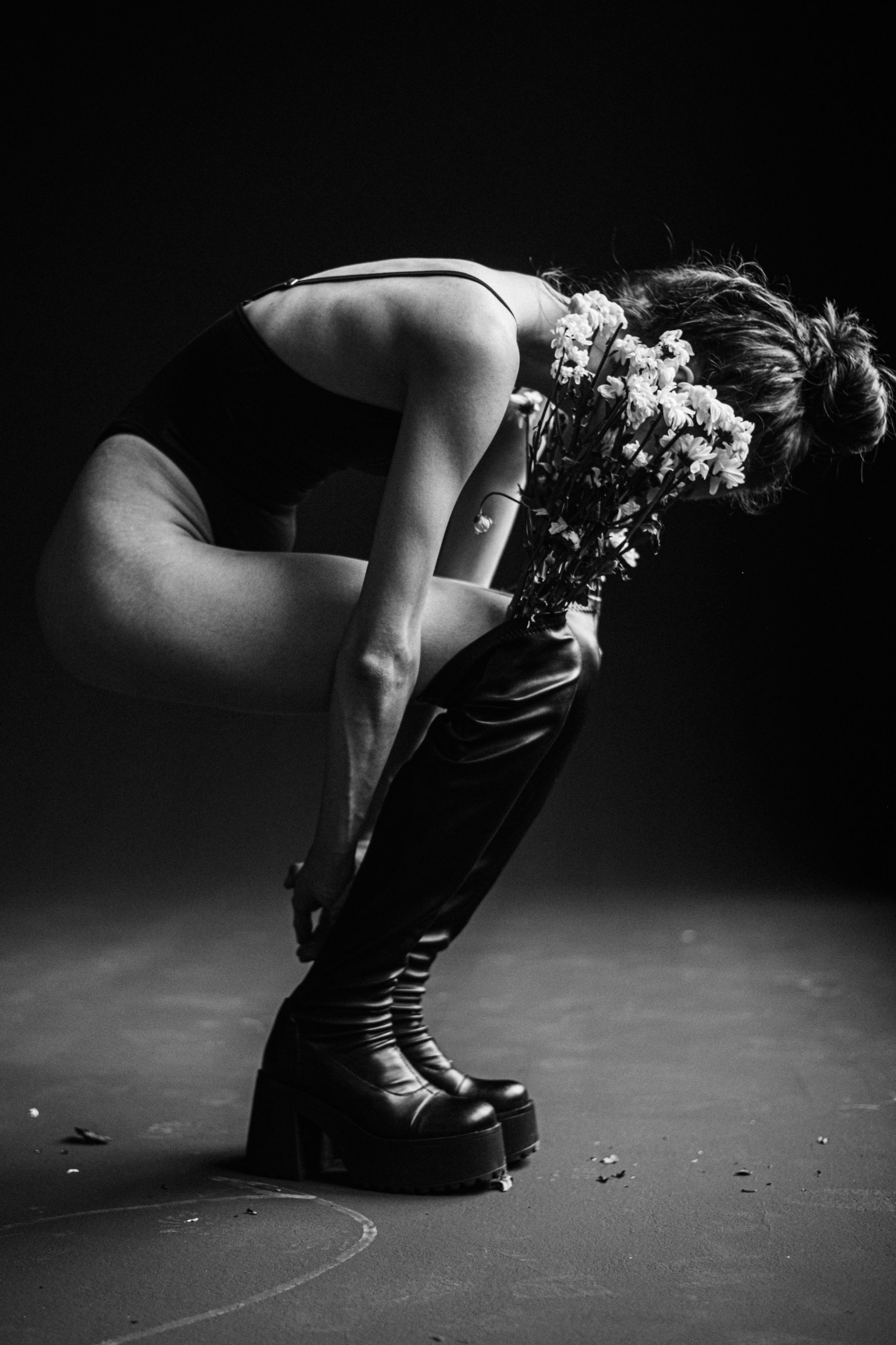 Фигура в изгибе — как будто застыла в движении. Цветы скрывают лицо, но тело говорит: это не просто поза, а внутреннее напряжение, возможно, болезненное. Свет подчёркивает силуэт, оставляя пространство в тени. Фотография передаёт драматизм и уязвимость, не прибегая к словам.