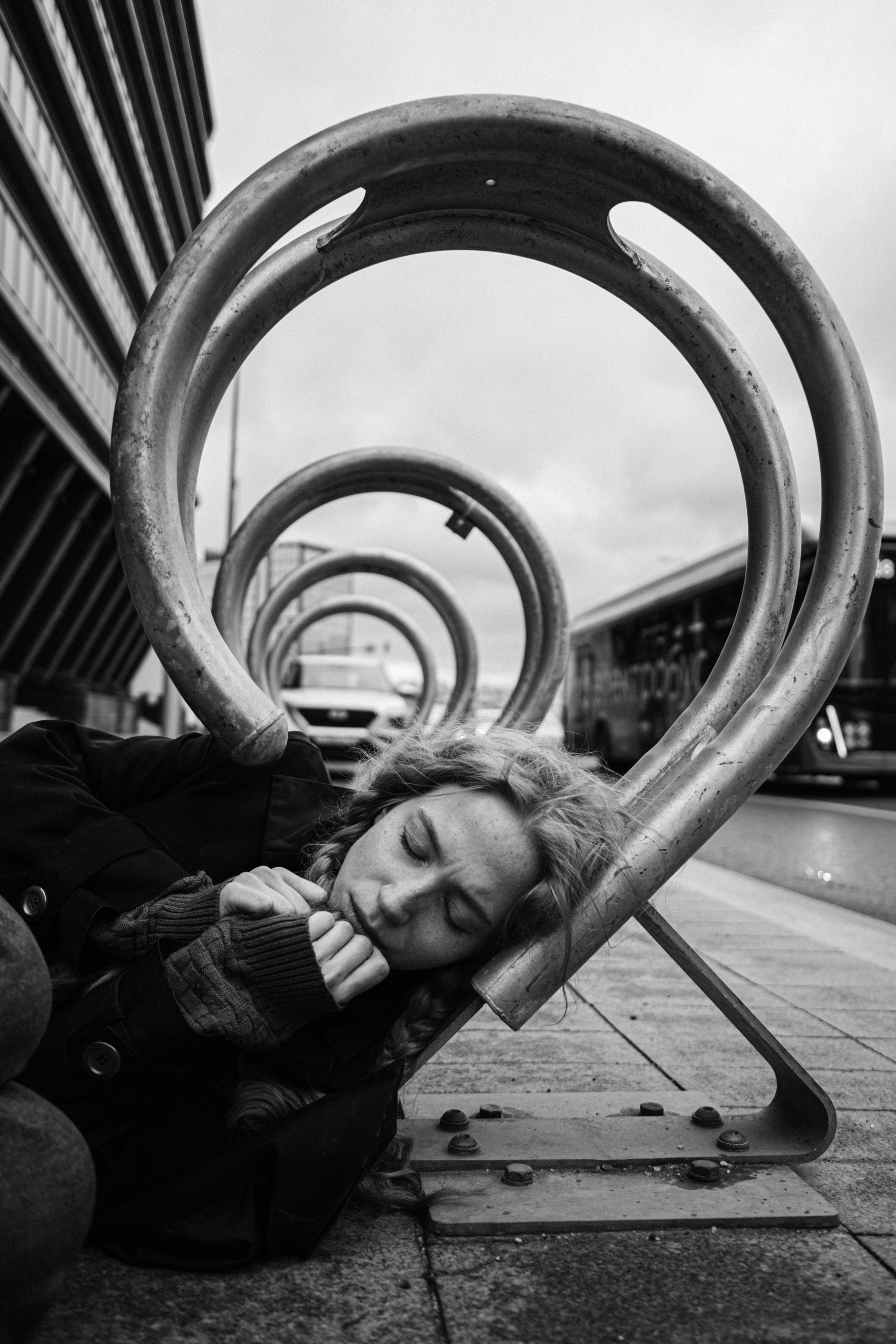 На фоне строгих линий зданий и повторяющихся дуг велосипедной стойки — лицо спящей девушки. Её поза естественна, почти беззащитна. Чёрно-белая палитра усиливает эмоциональный контраст между холодным металлом и тёплым человеческим присутствием. Фотограф Марина Щеглова фиксирует редкий момент тишины в ритме мегаполиса — где даже сон становится частью городского пейзажа.