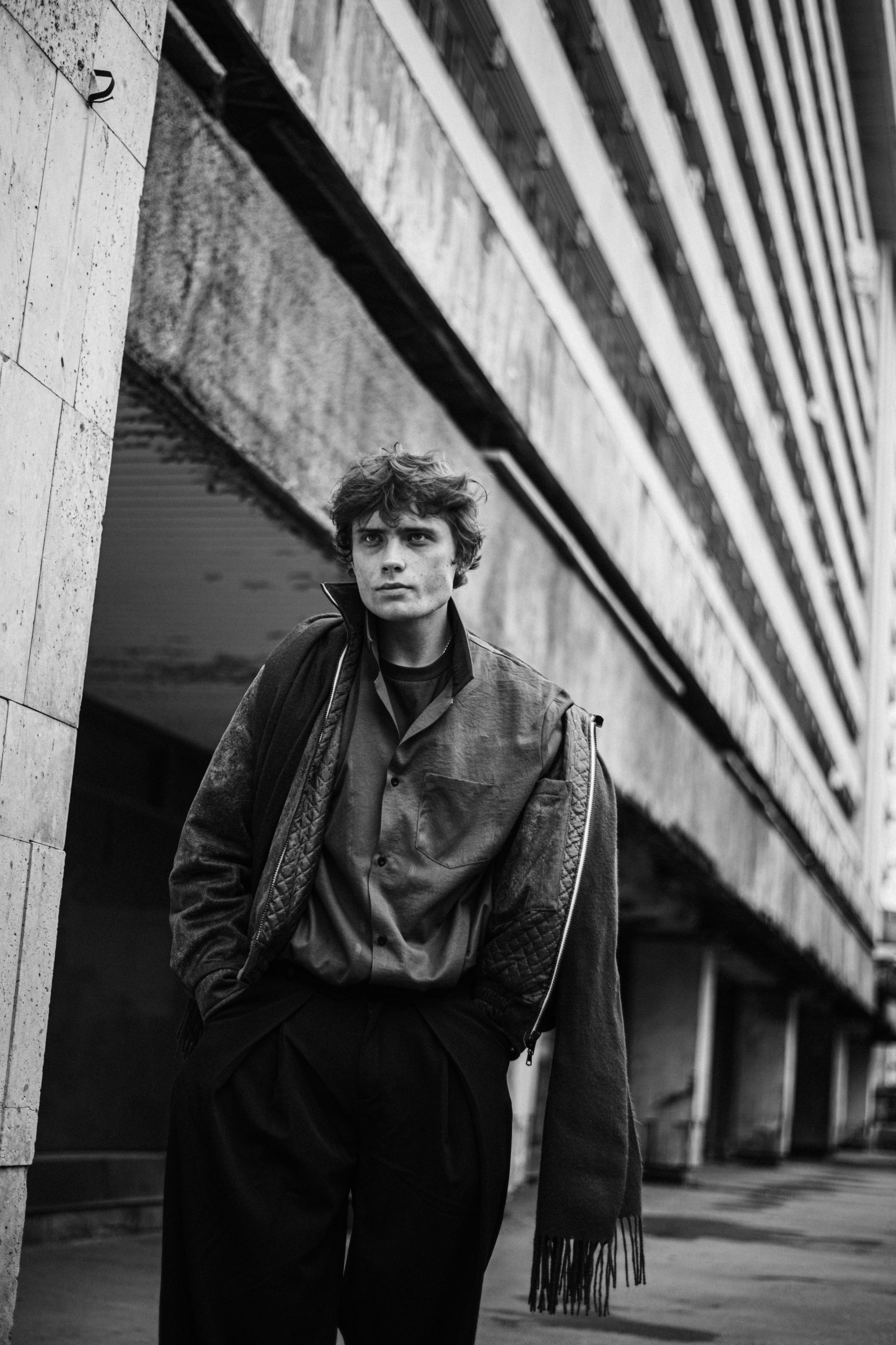 Черно-белый снимок молодого человека, стоящего на фоне современного здания с выраженной геометрией линий. Его поза и взгляд создают ощущение задумчивости и спокойствия, подчеркивая контраст между человеком и городским пространством.