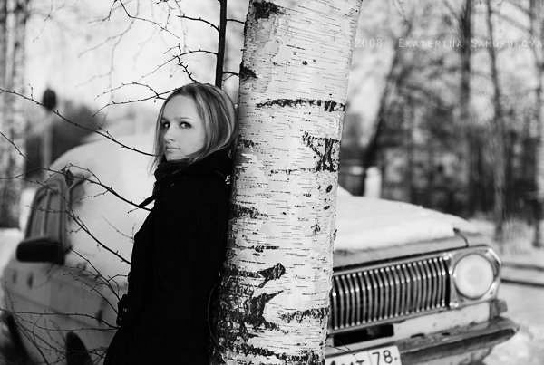 волга, газ24, машина, зима, снег, девушка, чб, Екатерина Саморукова