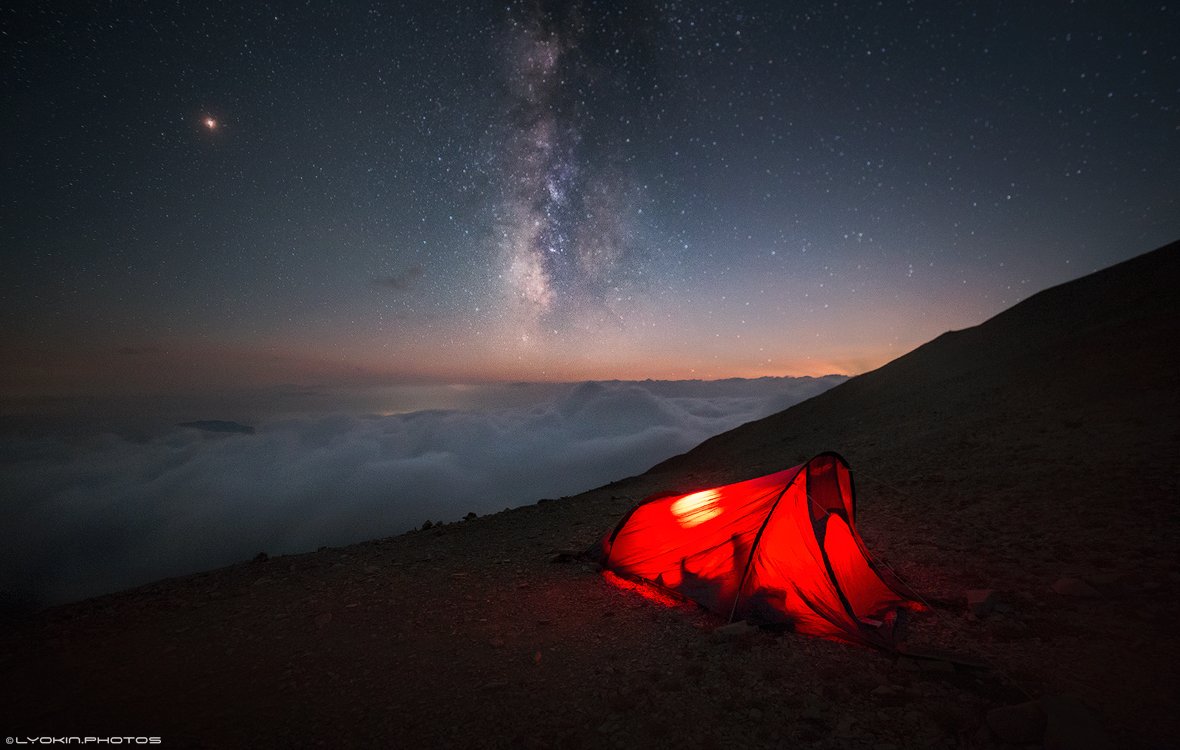 Я все ждал когда молнии, что сверкали со стороны, заиграют и на этих облаках, не давал спать в палатке - то и дело просил включать фонарь. Молнии не дошли и в кадр не попали.. Везению есть предел, но и вид на Млечный Путь и Марсом с морем облаков получился очень красивый...