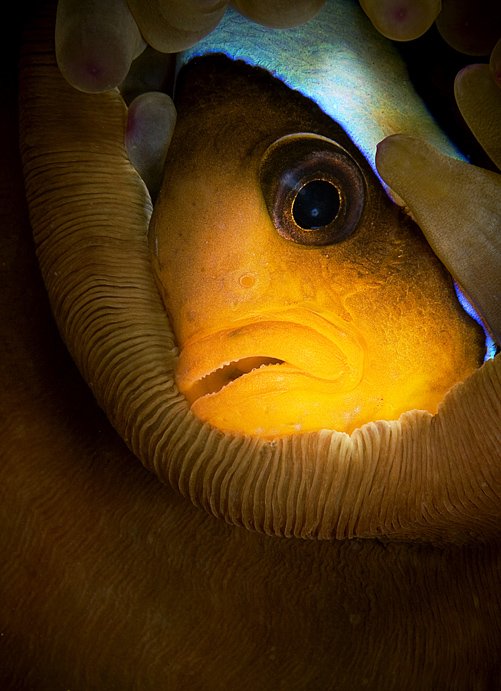 Пряталась от меня в свою свернувшуюся актинию. А её мужик в это время всячески защищал свою "даму сердца". В мире людей такую самоотверженность уже, к сожалению, нечасто встретишь. Вымираем, что ли?