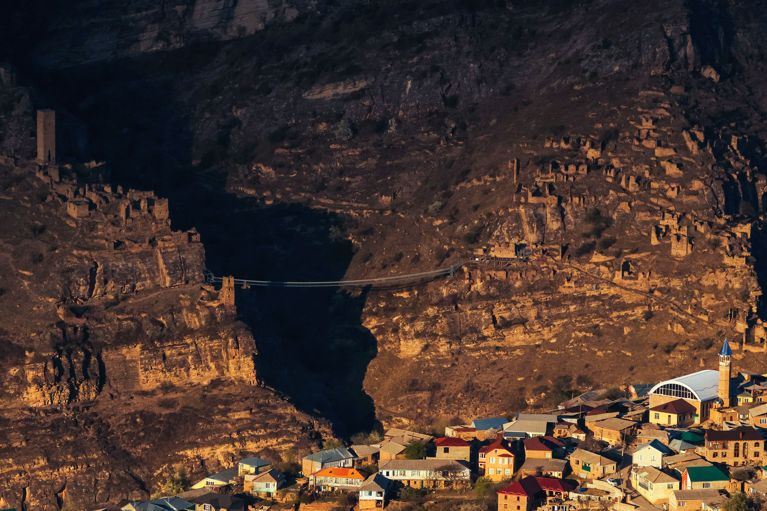 Вот это круть! И место само по себе чрезвычайно интересное и красивое, и свет очень удачно лёг осветив новый аул и спрятав в тень горы и ущелье. Супер фото!