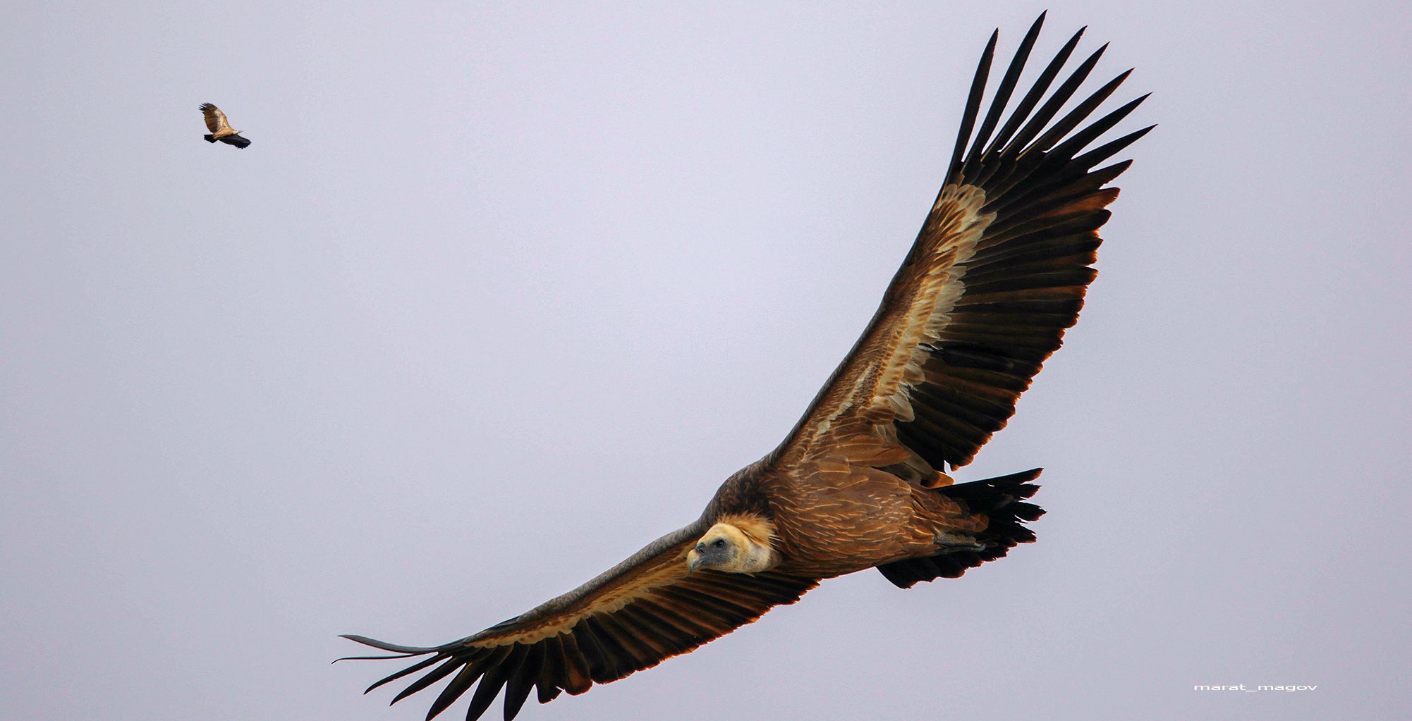 Итак, что же мы видим. Огромная парящая птица с обрезанным крылом (а это, увы, брак) на сером фоне. Плюс другая птица на заднем плане тоже в фокусе, а так не бывает в принципе. Конечно же, имхо.