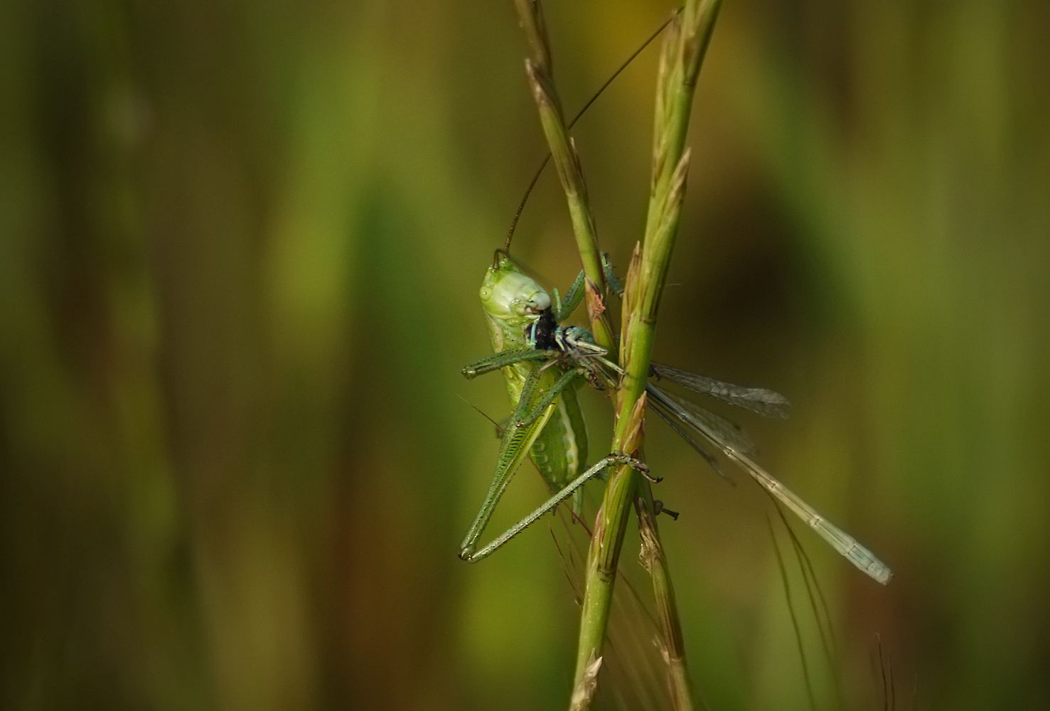 Стрекоза стала едой для коварного кузнечика..
