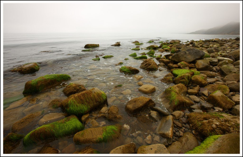 я показал красоту водорослей на камнях и туманый безграничный горизонт.