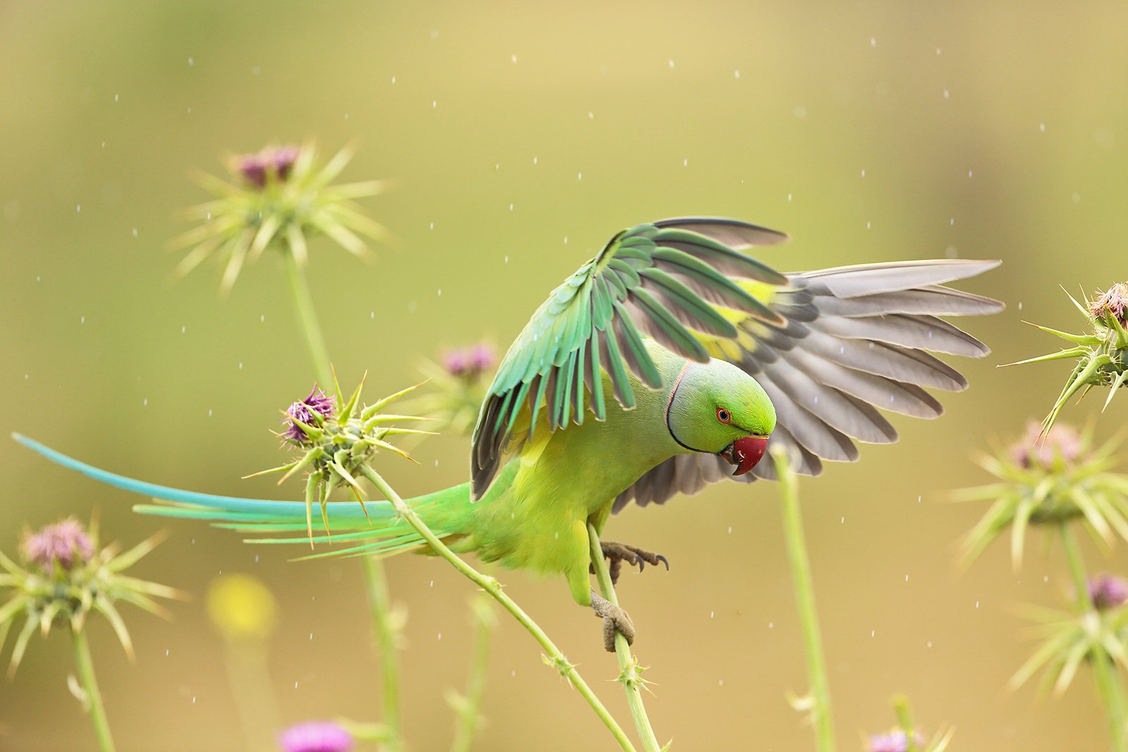 На снимке запечатлён момент, когда зелёный попугай, возможно, индийский розовощёкий, зависает в воздухе среди высоких цветущих растений. Крылья раскрыты, перья блестят, а капли дождя, застывшие в кадре, придают сцене динамику и свежесть. Фотография передаёт живость и красоту природы — птица, словно в танце, взаимодействует с элементами: влагой, ветром и светом. Работа Майкла Файмана — яркий пример макро-фотографии, где каждый элемент сцены — от текстуры перьев до капель — выстроен в единое целое.