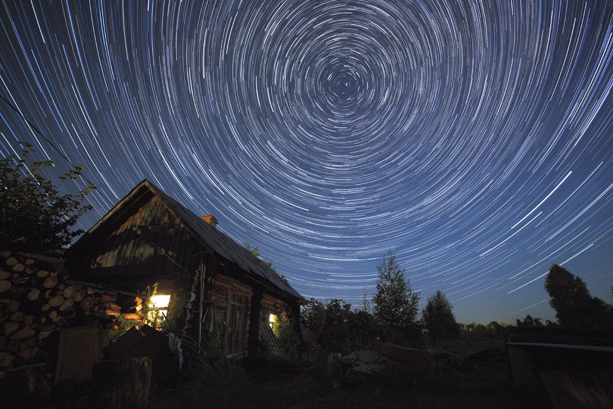 Снималось в 2012 году. Это, так сказать, первый опыт подобного рода съемки. Огромное спасибо Антону Янковому за отличную статью, касательно съемки с участием звезд, звездных трасс. При съемке были учтены пожелания (впрочем, с которыми я полностью согласен) и был включен свет в бане, которая присутствует в кадре.