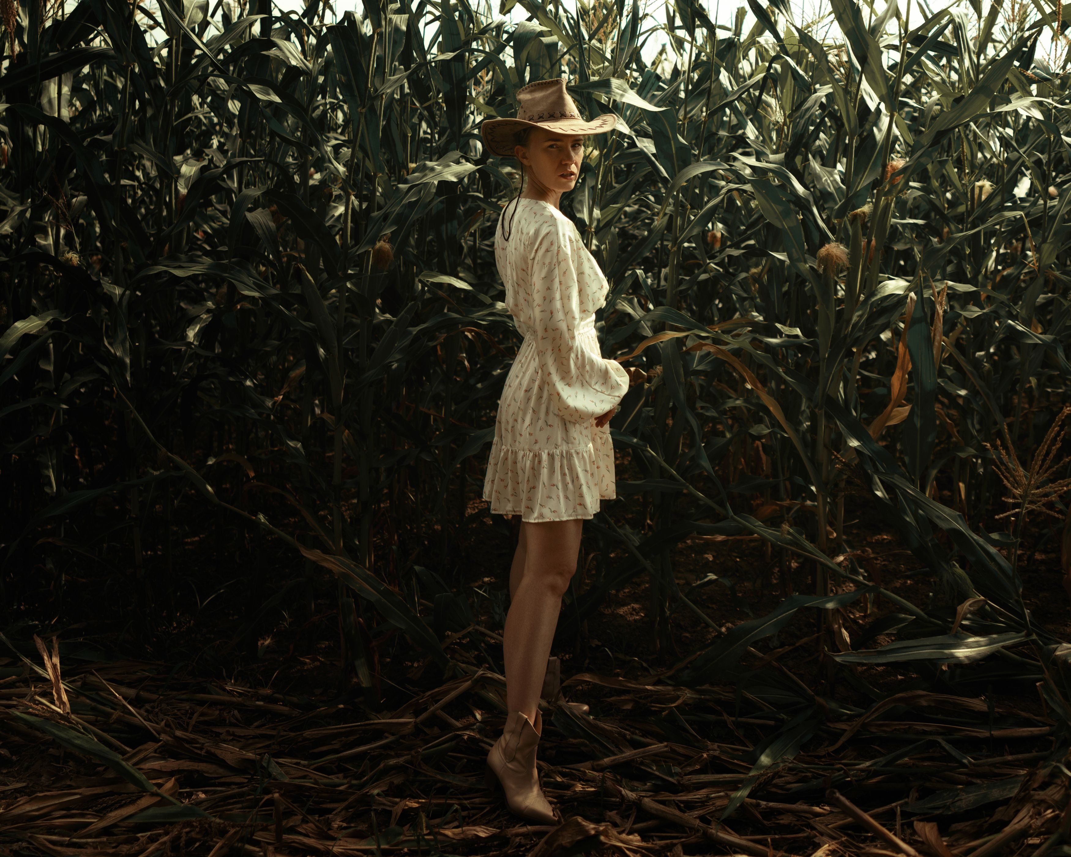 Девушка стоит в густом кукурузном поле, её фигура едва выделяется на фоне темных стеблей. Белое платье и шляпа создают контраст с зелёно-коричневой палитрой. Свет мягкий, рассеянный, словно поздний день. Поза — спокойная, задумчивая, будто она слушает шелест листьев. Фотография передаёт ощущение тишины, одиночества и связи с землёй. Снимок Салихова Максима — это мгновение, застывшее в природной плене.