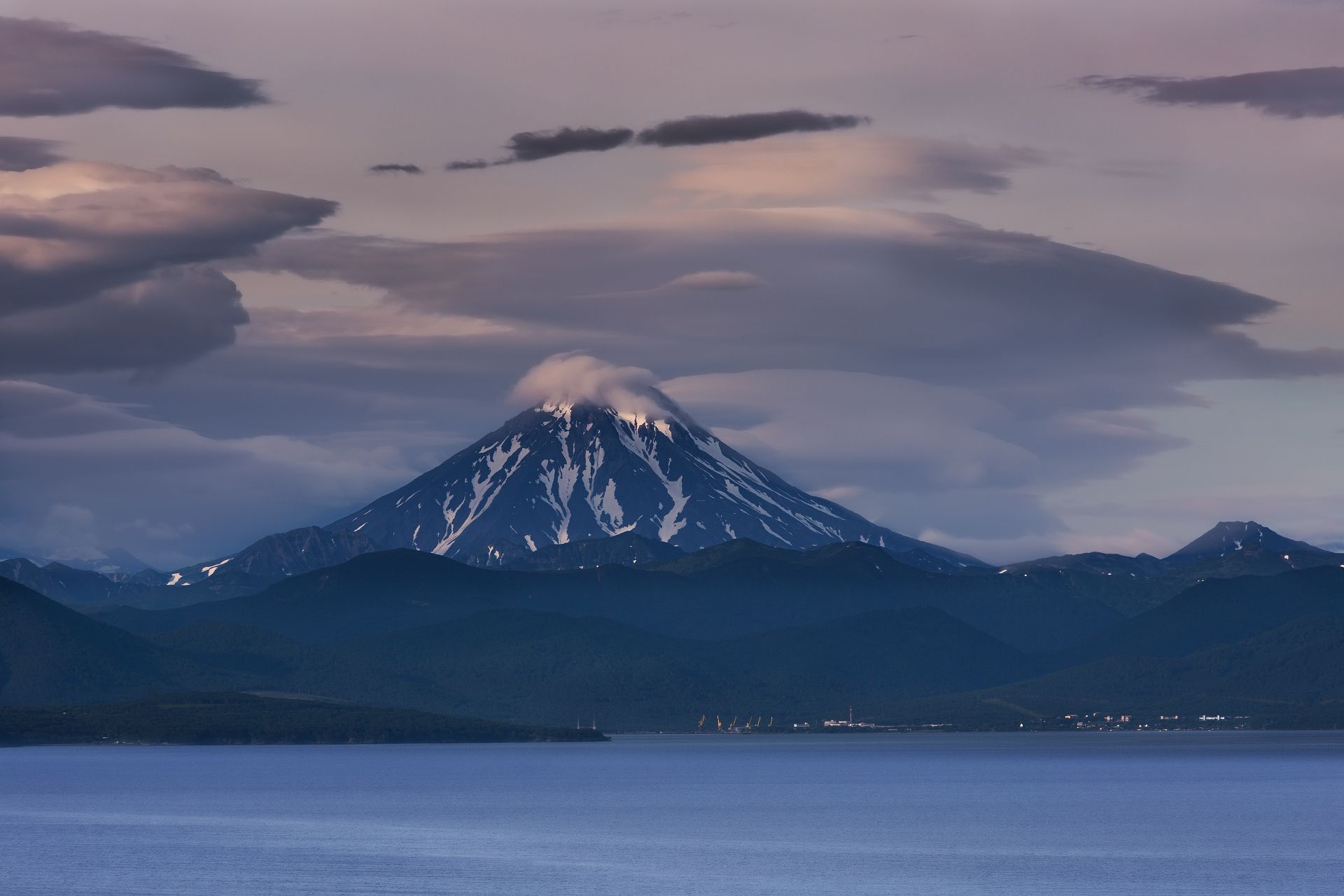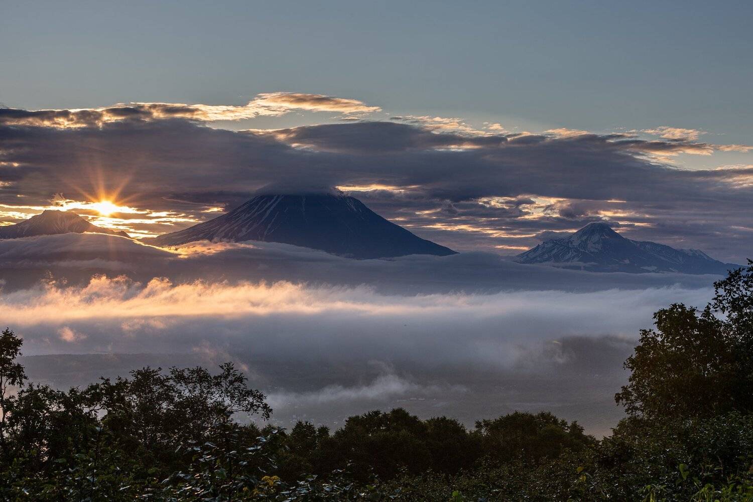 Встреча рассвета над вулканами Корякский, Авачинский, Ганальские остряки, утро над вулканом Вилючинский