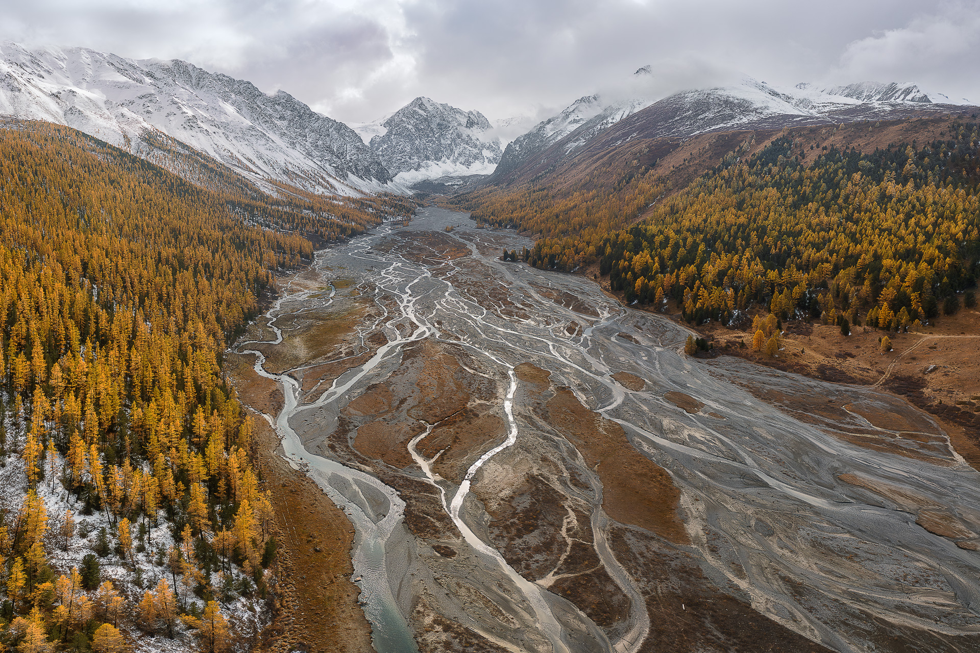 Аэрофотография долины Актру в Алтае демонстрирует контраст осенней листвы и снежных вершин. Река, разветвляясь на множество русел, создает сложный узор на дне долины. Снимок передает масштаб и дикую красоту горного ландшафта. Золотистые лиственницы и бурый грунт контрастируют с серыми водами и белыми вершинами. Это — типичный вид для высокогорных районов Алтая в переходный сезон.