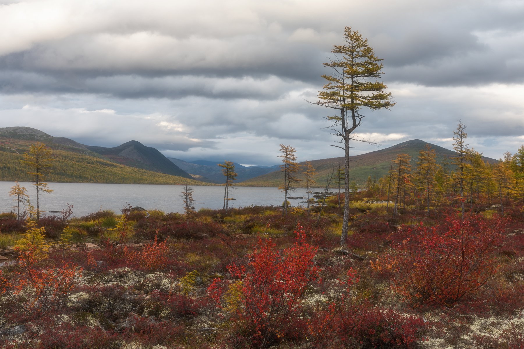 Невероятная удача попасть на озеро Джека Лондона золотой осенью. Застать ее не так просто, буквально на глазах краснеют березки Миддендорфа, желтеют лиственницы и становятся пурпурными бесконечные поля голубики, 10 дней и все опадает. Нам удивительно повезло, мы увидели все эти чудесные превращения!
