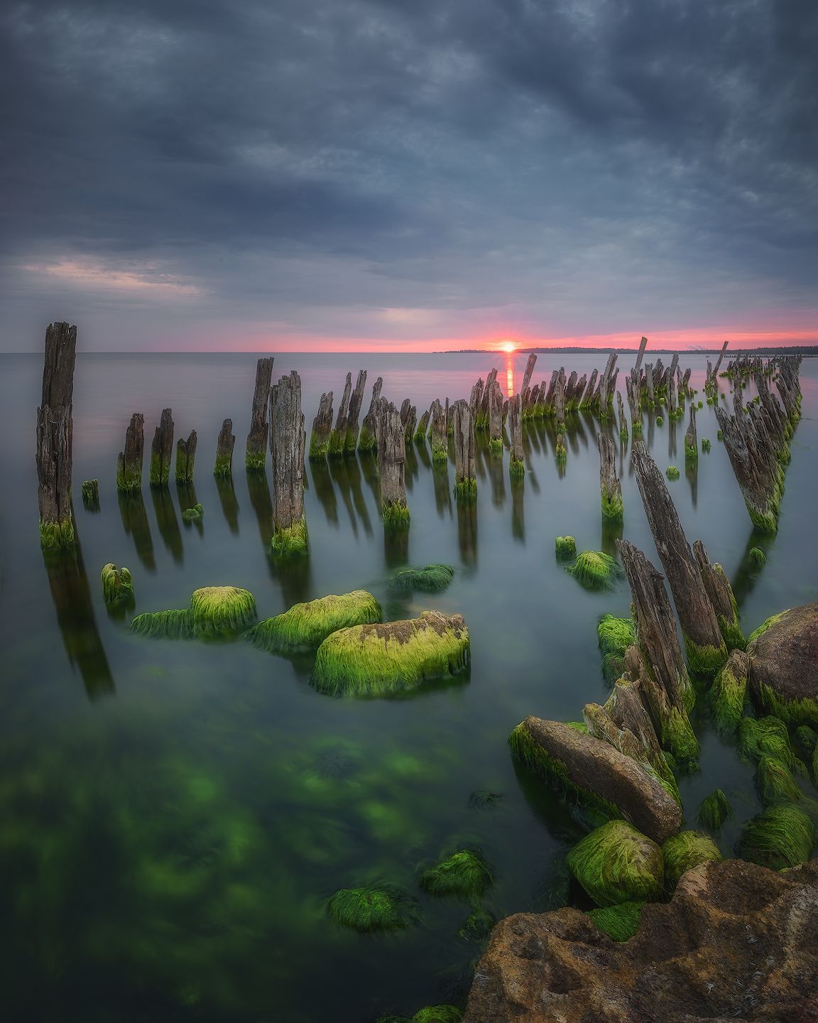 На берегу финского залива в Ленобласти — тихий утренний пейзаж. Старые, обветшалые сваи, когда-то служившие опорами для причалов, торчат из воды, покрытые зелёным мхом и водорослями. Над горизонтом — розовый отблеск восходящего солнца, разрезающий тёмные облака. Вода зеркально отражает силуэты свай, создавая ощущение тишины и заброшенности. Лето, утро, природа в состоянии почти мистического покоя.