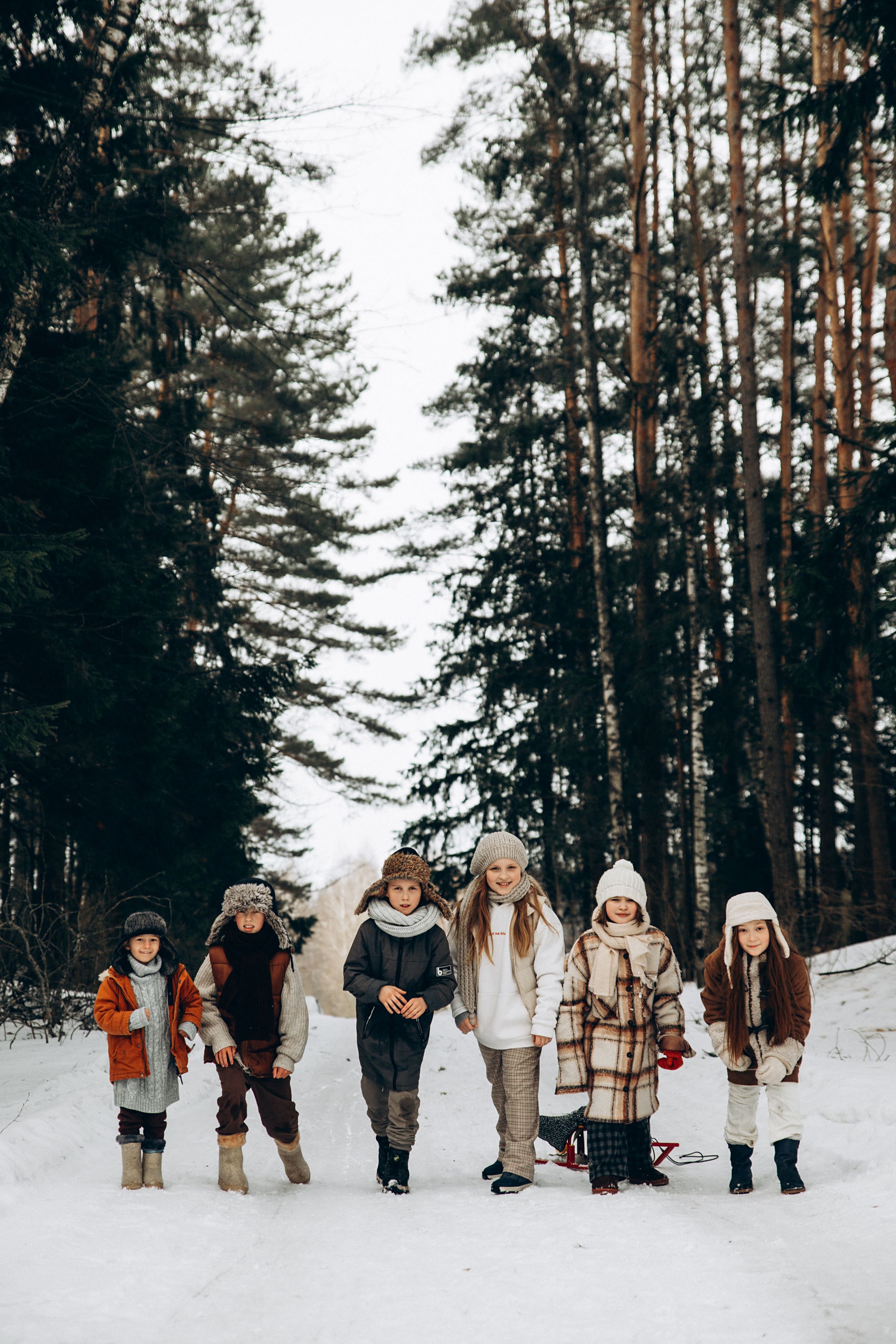 Фотография передаёт атмосферу зимнего леса: дети в теплой одежде стоят в снегу, фон — высокие хвойные деревья. Композиция сбалансирована, свет мягкий, цветовая гамма приглушённая, что подчёркивает естественность момента.