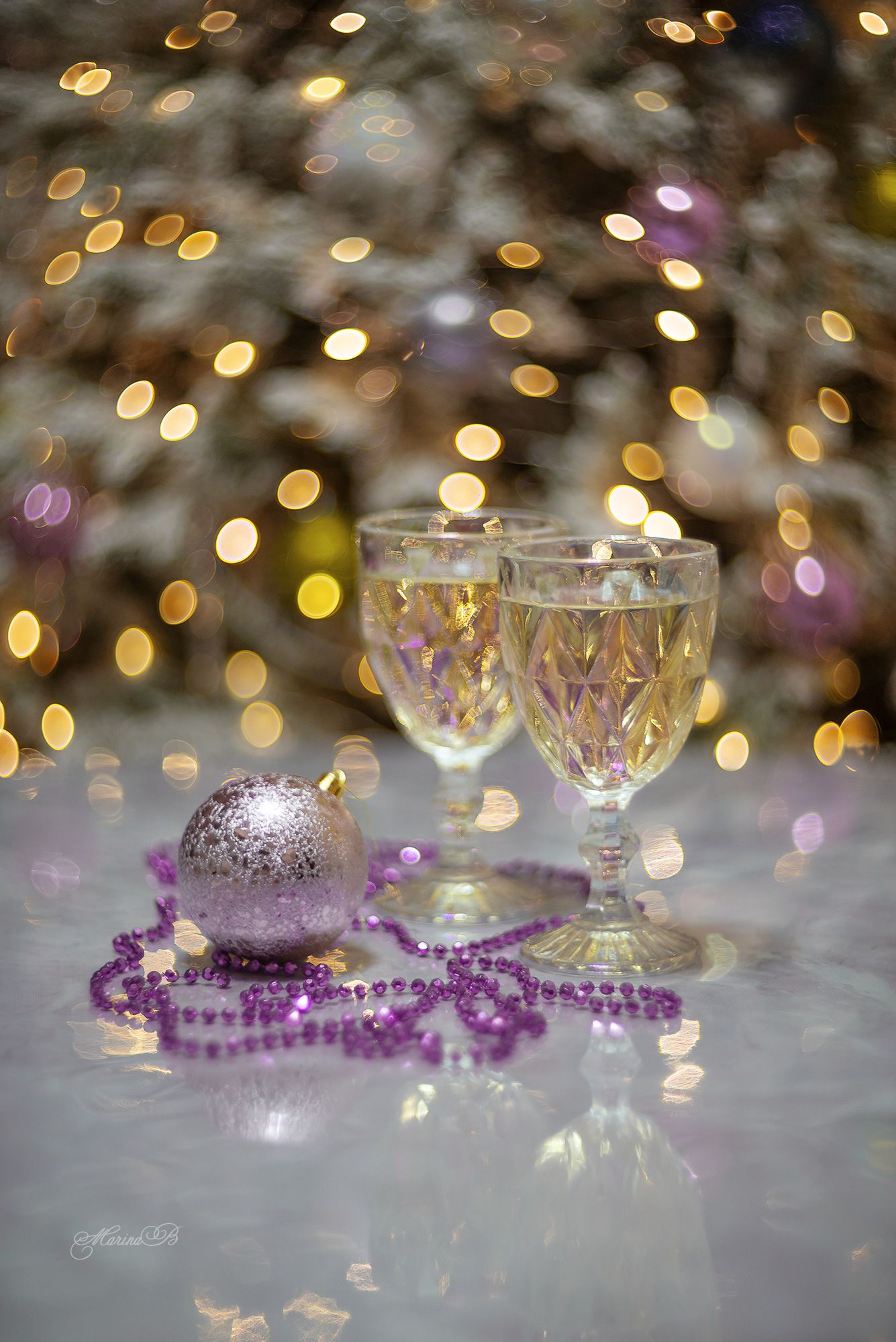ёлочный шарик, боке, гирлянда, бокалы шампанского, новый год, Baccardi Marina