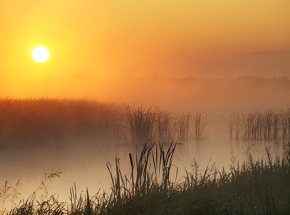 утро, туман, река, солнце, восход, камыш, Марина Брыдня