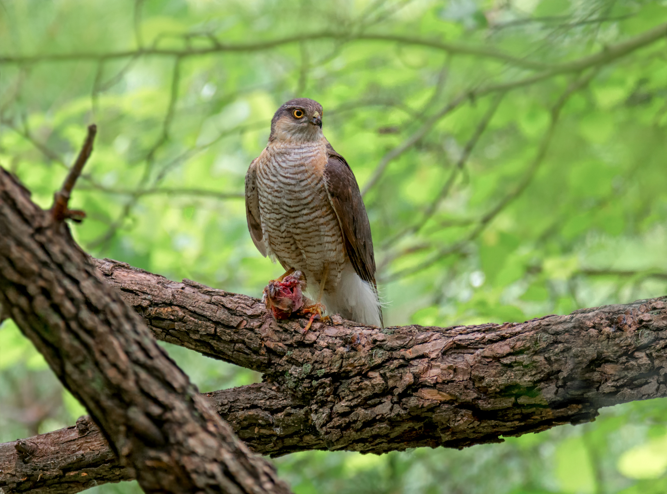 Фотография — ястреб на ветке с добычей. Композиция чёткая, фон размыт, птица в фокусе. Освещение естественное, детали оперения видны, поза — характерная для хищника в момент отдыха после охоты. Добыча — перепелятник, как указано в тегах — это хорошо, так как подчёркивает поведенческий контекст.
