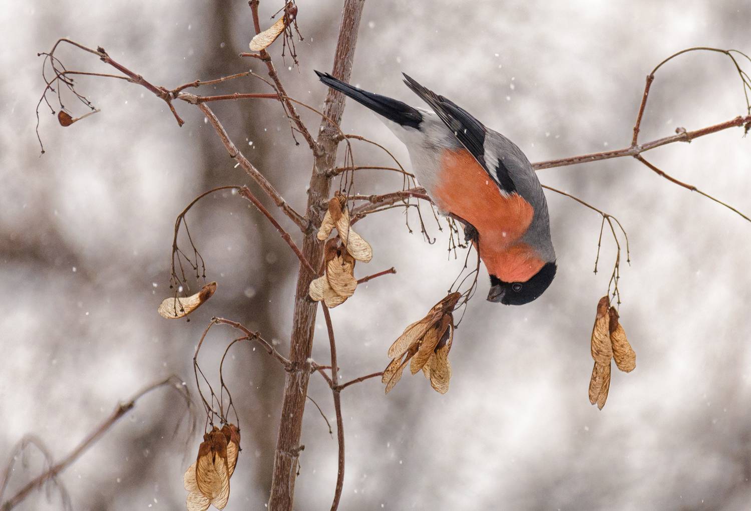 У нас они в основном по макушкам.., т. к. внизу ранетки высохли, семечки не достать! Вот, на вертолётиках..., хорошо, что деревья не сильно высокие. Ааа, ещё их можно увидеть на сирени - на семенах. )) Спасибо, Лора!