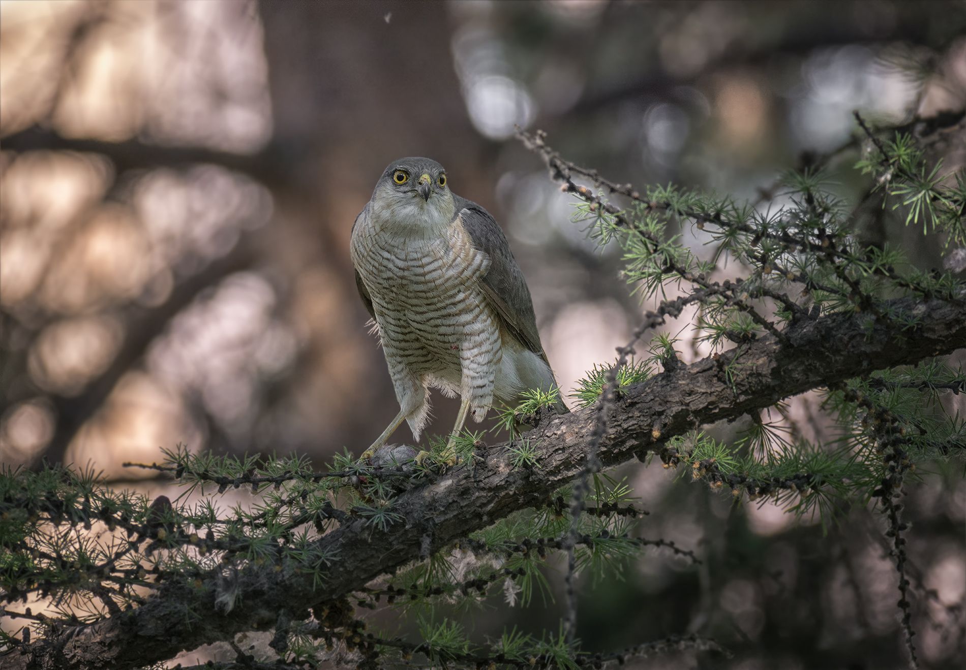 я ещё рада была, что он сел на фоне ствола дерева, иначе бы снимок не получился.. это момент, он спохватился, увидев меня рядом, и поднялся выше (его самка ждала - у него трофей в лапе)